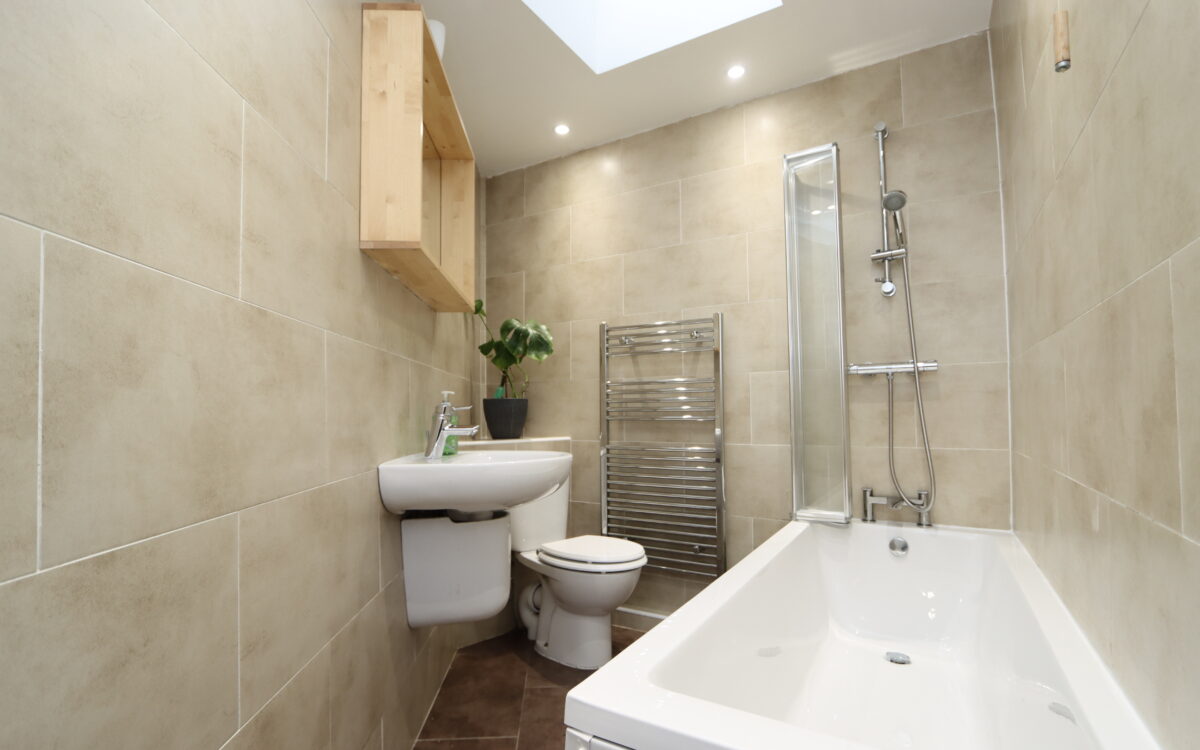 BATHROOM: 9’ 1” x 6’ 11” with tiled walls & floor, panelled bath with screen & mixer shower, wall mounted washbasin with mixer tap, low level WC, skylight, 5 concealed down lighters, ‘Xpelair’ extractor fan, stainless steel upright towel radiator plus airing/store cupboard.