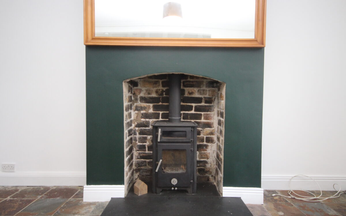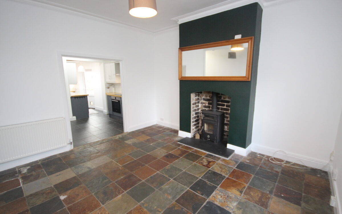 LIVING ROOM: 16’ 0” x 14’ 0” open plan to the dining kitchen with tiled floor, 2 radiators, staircase to first floor, uPVC double glazed window with roller blind with a pleasant aspect overlooking the front garden, plastered chimney breast with exposed brick recess with slate hearth housing log burner, corniced ceiling and open arch to dining kitchen.