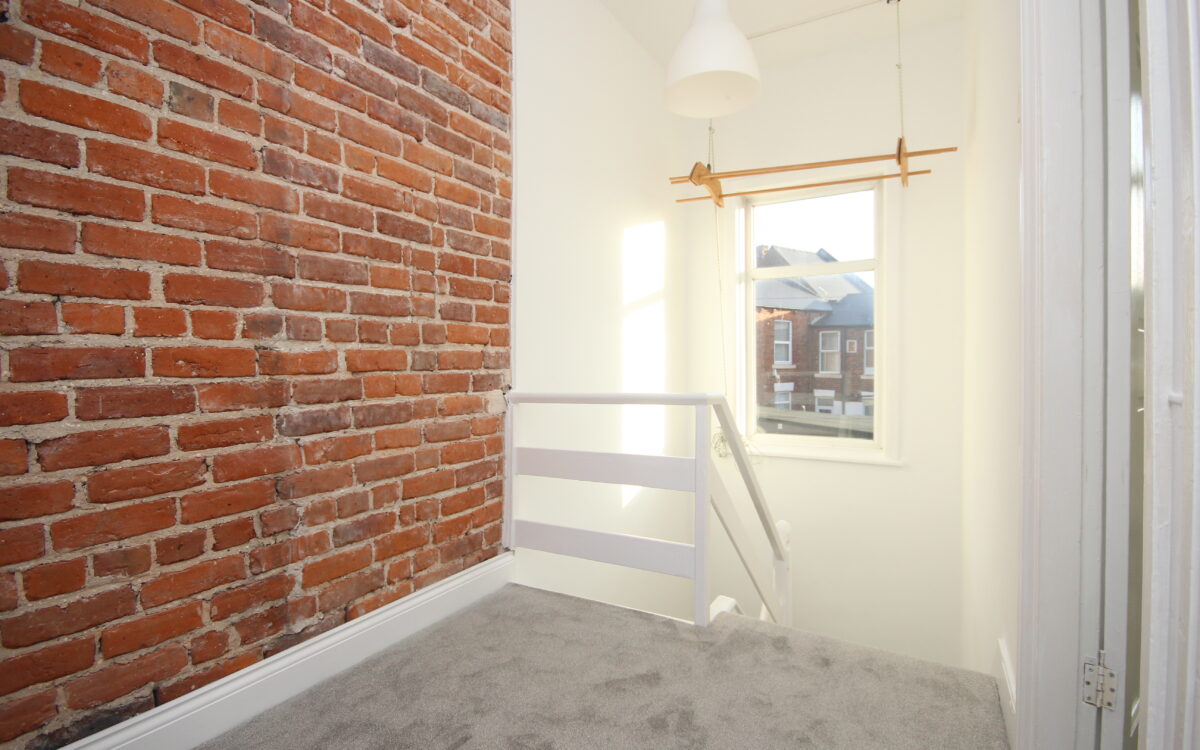 LANDING: with exposed brick feature wall, access to loft space and large uPVC double glazed window with provides an abundance of natural light.
