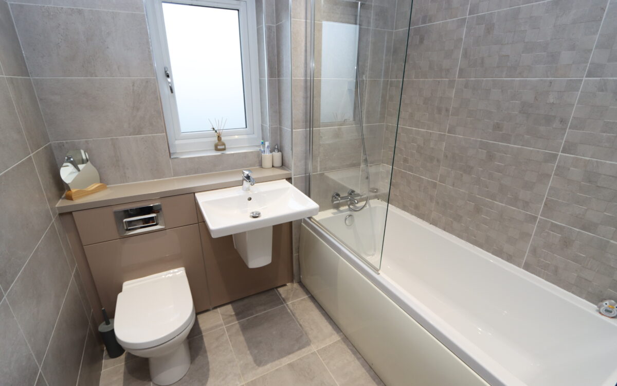 BATHROOM: fully tiled, panelled bath with shower over & screen, washbasin, low level WC, upright stainless-steel towel radiator, extractor fan, 4 concealed downlighters & uPVC double glazed window.