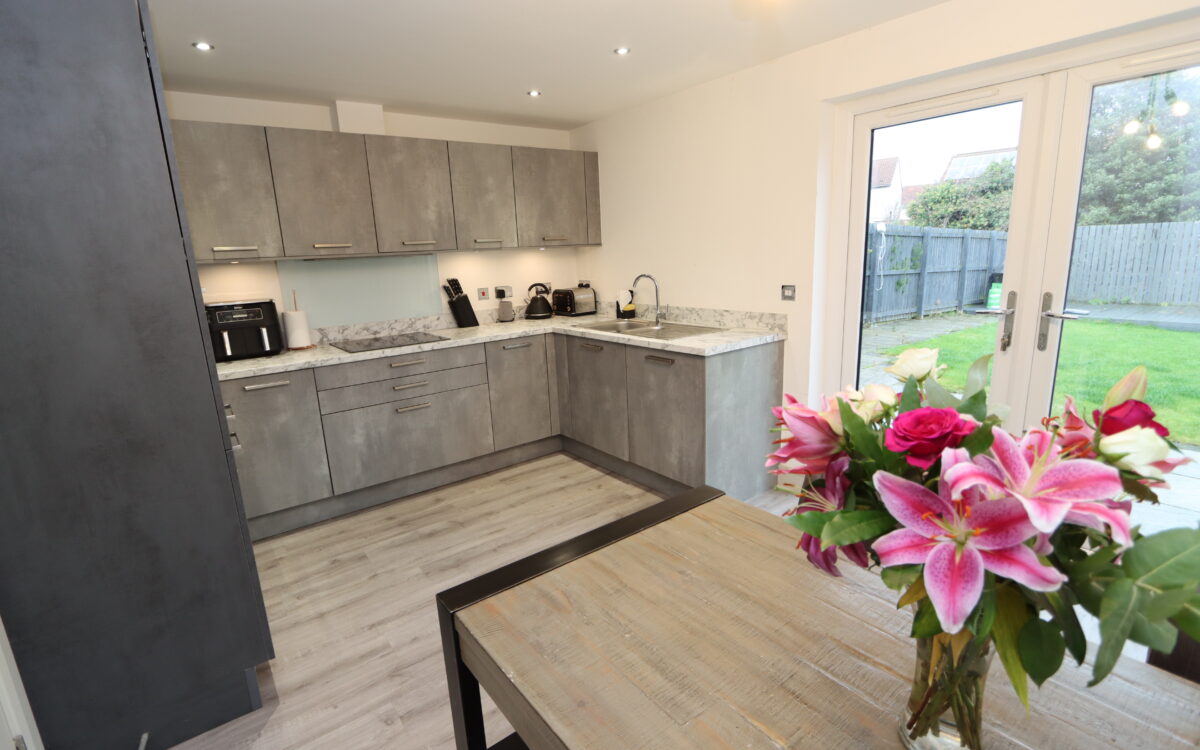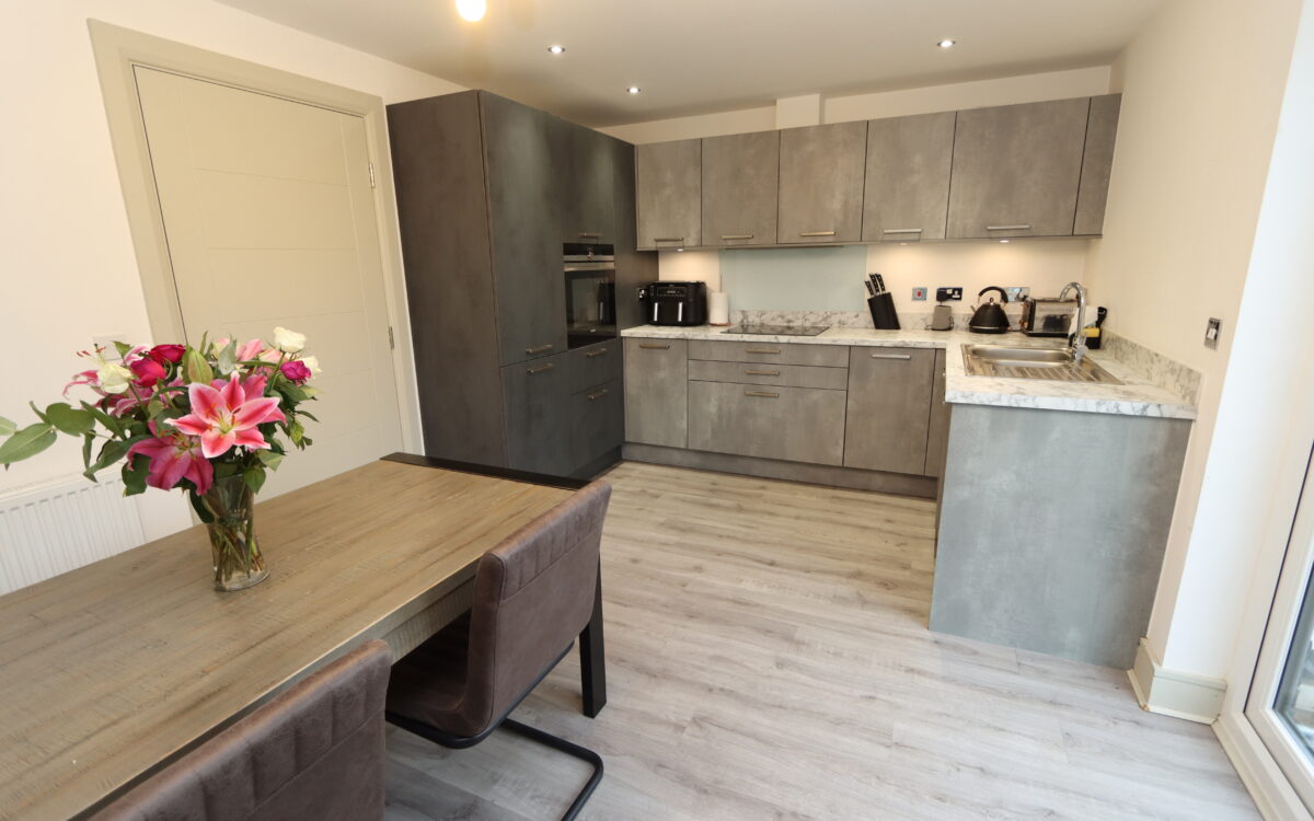 DINING KITCHEN: 10’6″ x 14’3″ (3.20m x 4.34m) with fitted wall & floor units, ‘Siemens’ induction hob, ‘Siemens’ eye-level oven, integrated ‘Siemens’ dishwasher, 1½ bowl sink, integrated fridge freezer and uPVC double glazed double opening doors to rear garden.