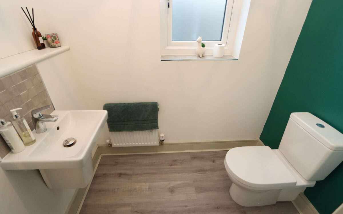 DOWNSTAIRS WC: with low level WC, washbasin, radiator, extractor fan & uPVC double glazed window.
