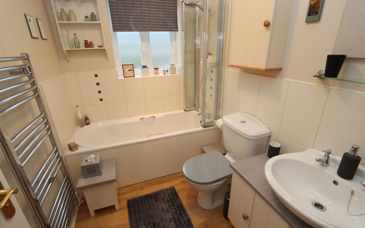 BATHROOM: partially tiled walls, panelled bath with shower over and screen, low level WC, vanity unit,