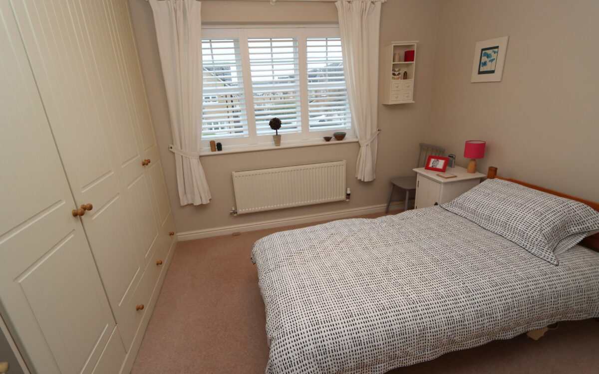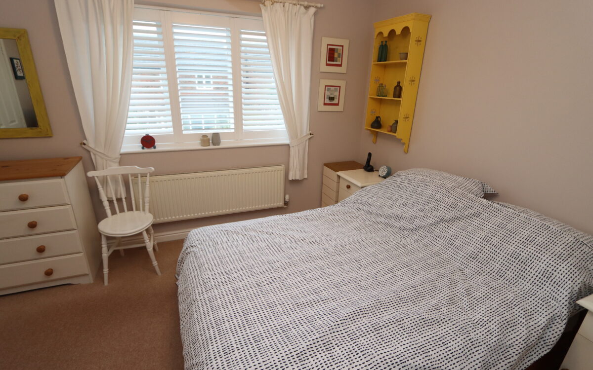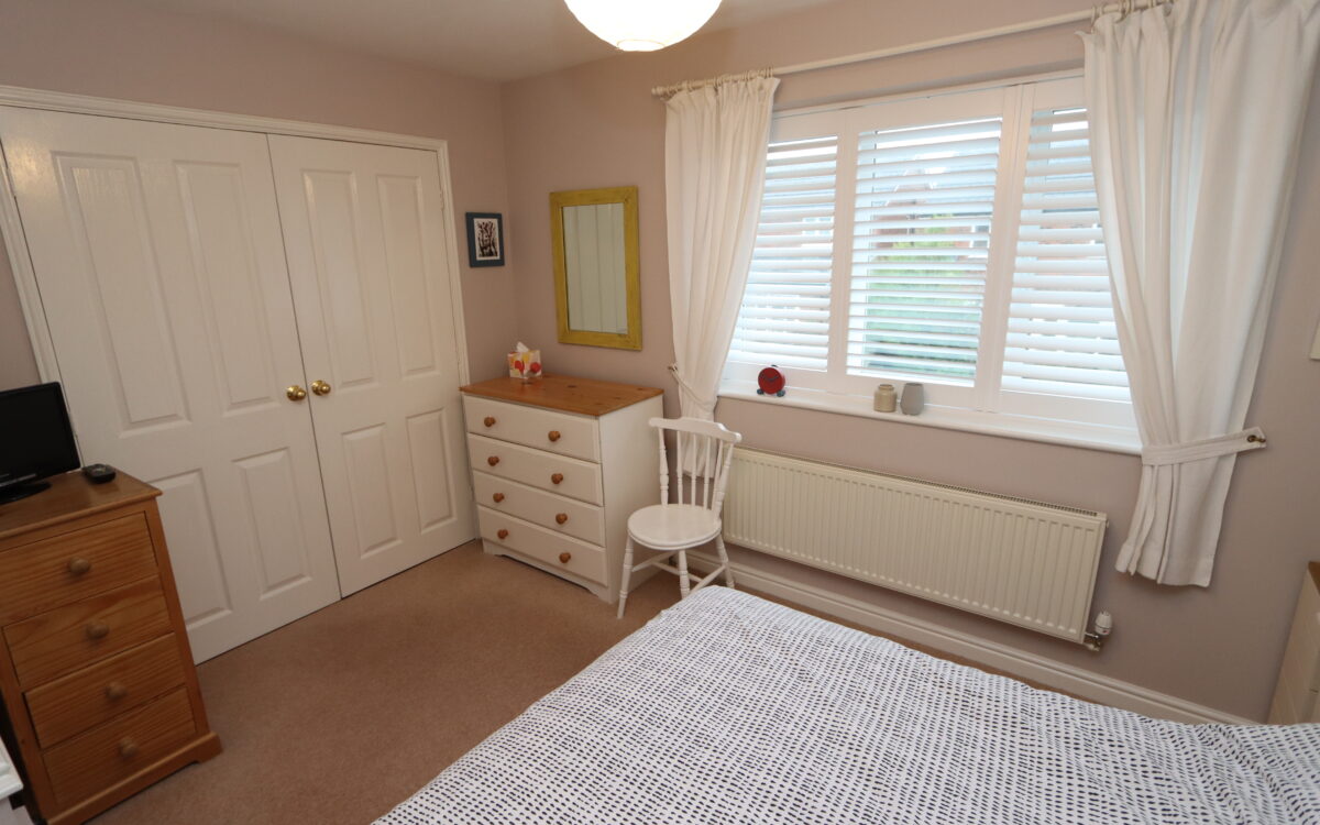 No. 1: at the rear 12’2″ x 9’9″ (3.71m x 2.97m) plus double fitted wardrobe, including fitted cupboard, radiator and uPVC double glazed window with plantation shutters.