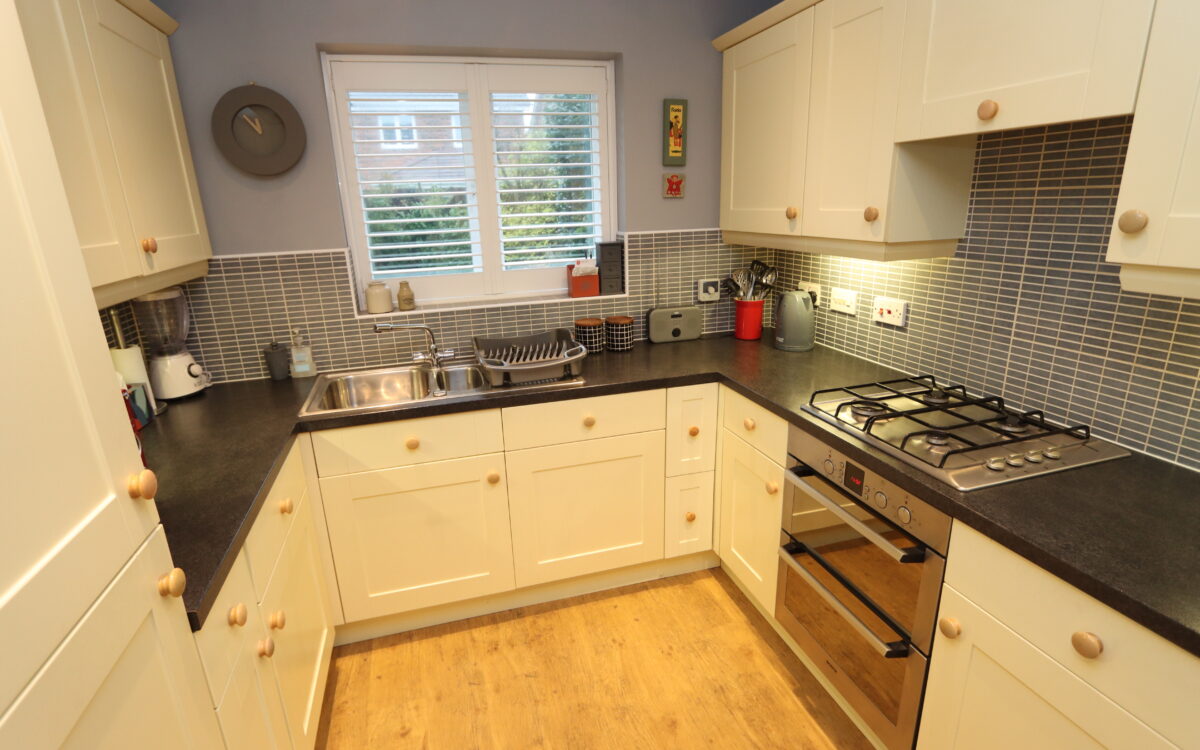 KITCHEN: 10’5″ X 8’6″ (3.17m X 2.59m) with fitted wall and floor units, partially tiled walls, radiator, 1½ bowl stainless steel sink, ‘Bosch’ gas hob, ‘Bosch’ oven, integrated ‘Bosch’ dishwasher, 6 concealed downlighters, illuminated working surfaces, uPVC double glazed window with plantation shutters, door to side entrance and door to inner hall.