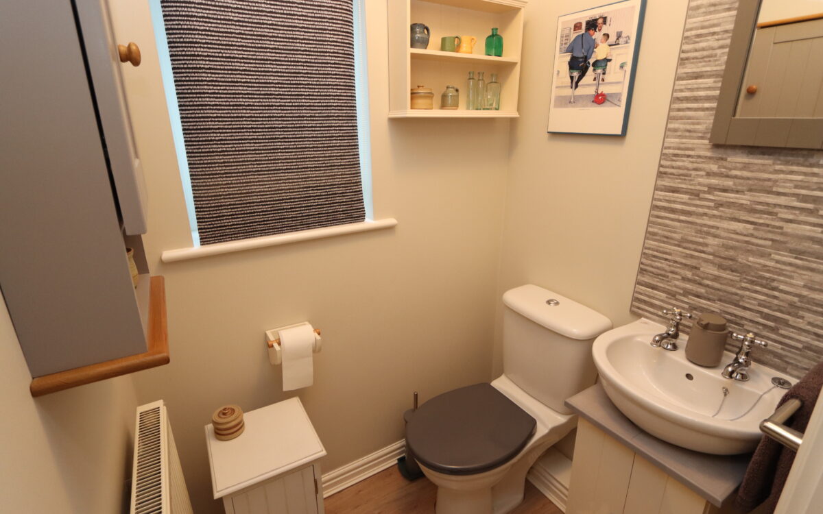INNER HALL: with fitted cloaks cupboard and cloakroom – low level WC, vanity unit, radiator and uPVC double glazed window.
