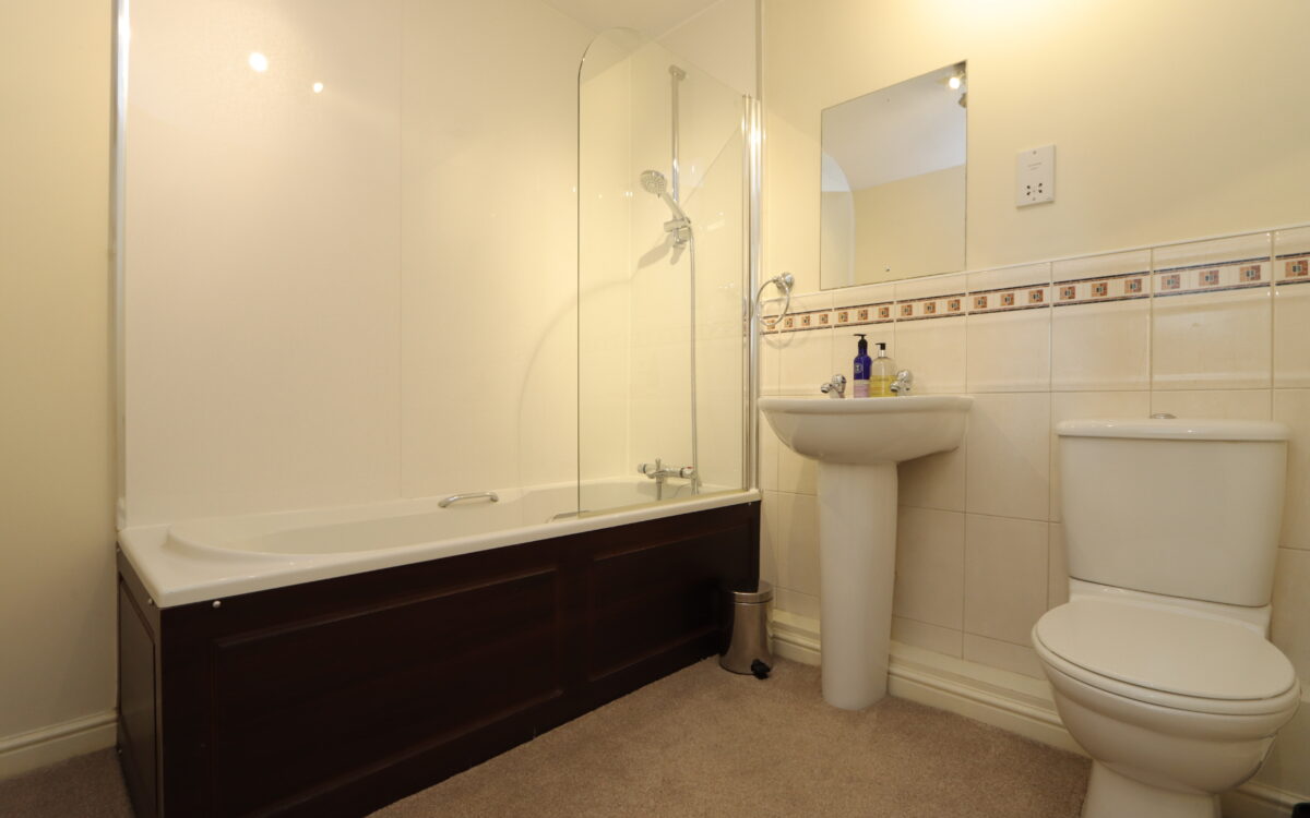 BATHROOM: part-tiled walls, panelled bath with shower over & screen, pedestal washbasin, low level WC, shaver point, radiator & extractor fan.