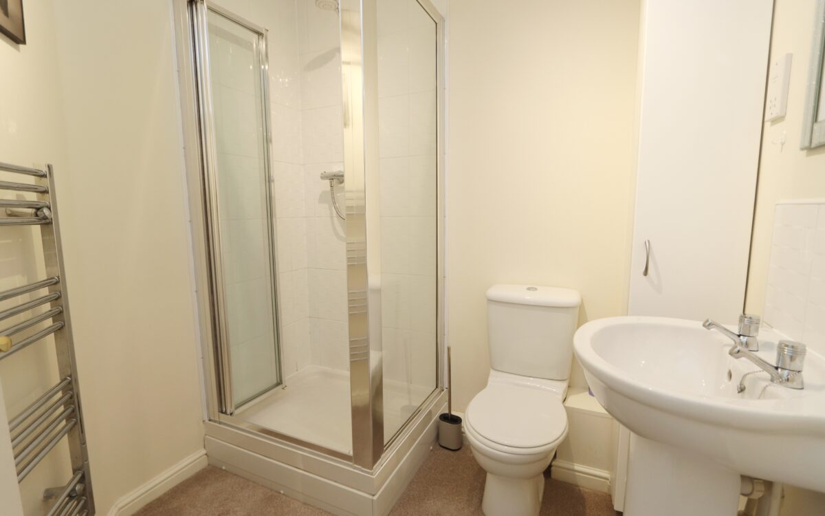 plus: EN-SUITE SHOWER ROOM: fully tiled shower cubicle, pedestal washbasin, low level WC, vertical stainless steel towel radiator, shaver point, fitted storage cupboard, extractor fan & 4-spot centre light.