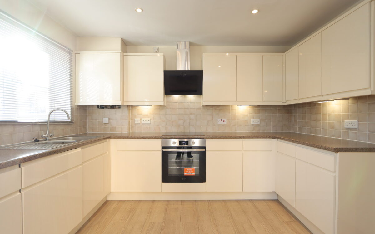 KITCHEN AREA: 11′ 1″ x 7′ 3″ (3.38m x 2.21m) part-tiled walls, cream ‘hi-gloss’ fitted wall & floor units, illuminated working surfaces, ‘Indesit’ oven replaced Oct 2025, induction hob, illuminated ‘contemporary’ extractor hood, 1½ bowl stainless steel sink with mixer tap, integrated ‘Beko’ washing machine, cupboard containing ‘Baxi’ combi boiler on a ‘Hive’ system installed 2022, 4 concealed downlighters & uPVC double glazed window.