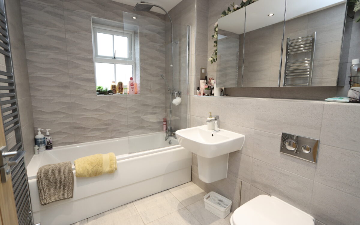 BATHROOM: tiled floor, tiled walls & feature wall, back to wall WC, wall mounted washbasin with mixer tap, panelled bath with shower over, screen & secondary shower hose, upright stainless steel towel radiator, mirrored medicine cabinet, concealed down lighters and uPVC double glazed window.