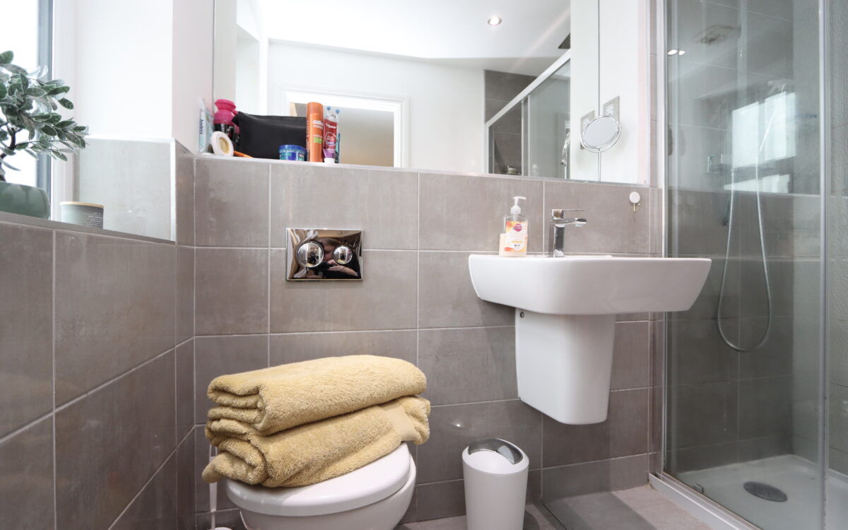 EN-SUITE SHOWER ROOM: tiled floor, part tiled walls, tiled walk-in shower enclosure, wall mounted washbasin, back to wall WC, stainless steel upright towel radiator, uPVC triple glazed window and concealed down lighters.