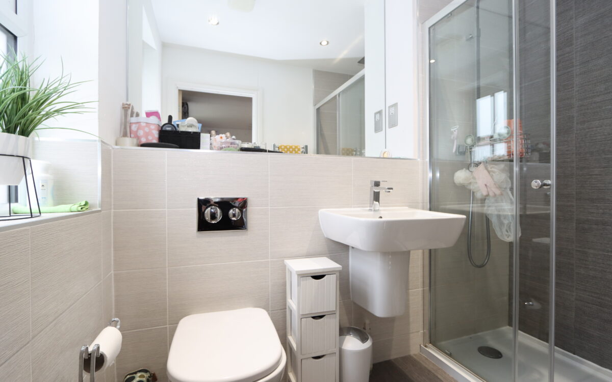 EN-SUITE SHOWER ROOM: tiled floor, part tiled walls, tiled walk-in shower enclosure, wall mounted washbasin, back to wall WC, stainless steel upright towel radiator, uPVC double glazed window and concealed down lighters.