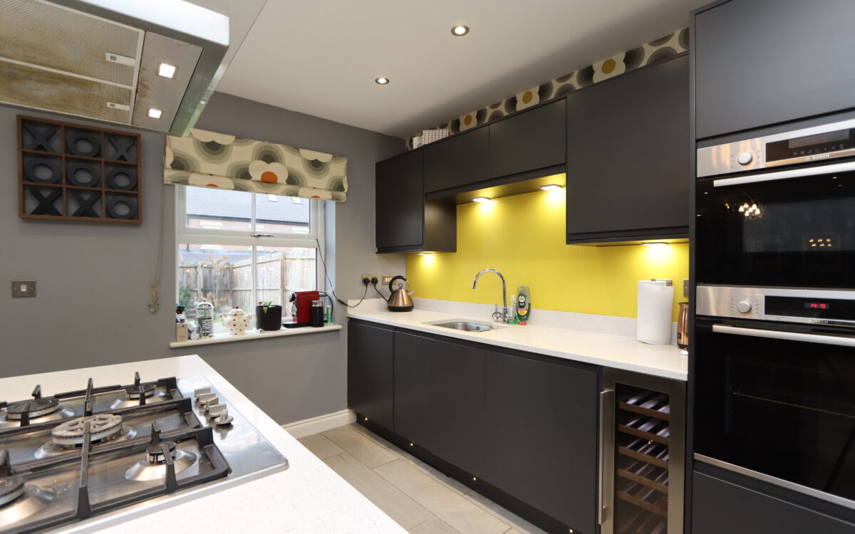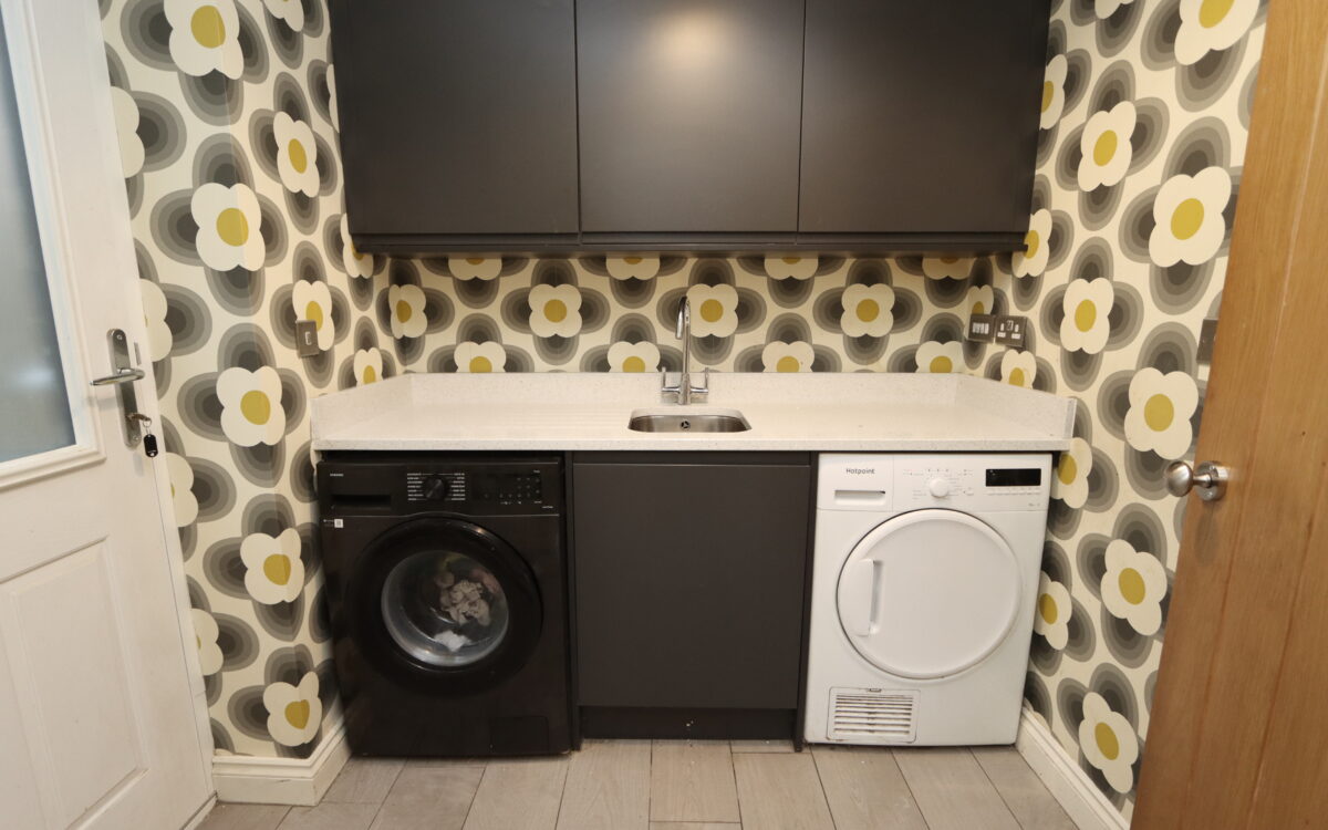 UTILITY ROOM: 6’ 7” x 6’ 2” (2.01m x 1.88m), door to side entrance, radiator, plumbing for washing machine, ‘Silestone’ benchtop & upstand incorporating stainless steel sink, mixer tap & ‘Silestone’ drainer, plumbing for washing machine, understairs store cupboard and fitted wall & floor units.