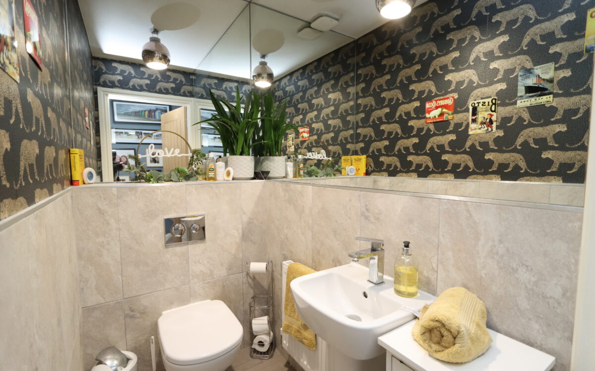 DOWNSTAIRS WC: ½ tiled walls, ½ mirrored walls, back to wall WC, floating washbasin with mixer tap, extractor fan and radiator.