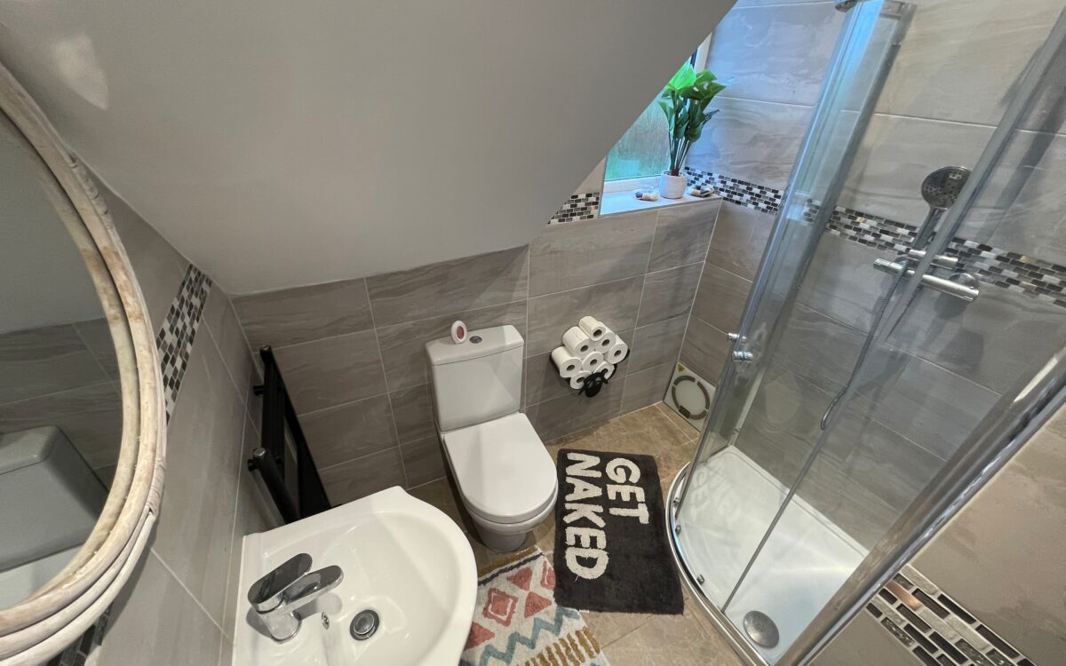 REFITTED SHOWER ROOM: with tiled walls & floor, upright towel radiator, vanity unit, low level WC, shower cubicle, extractor fan & uPVC double glazed window.