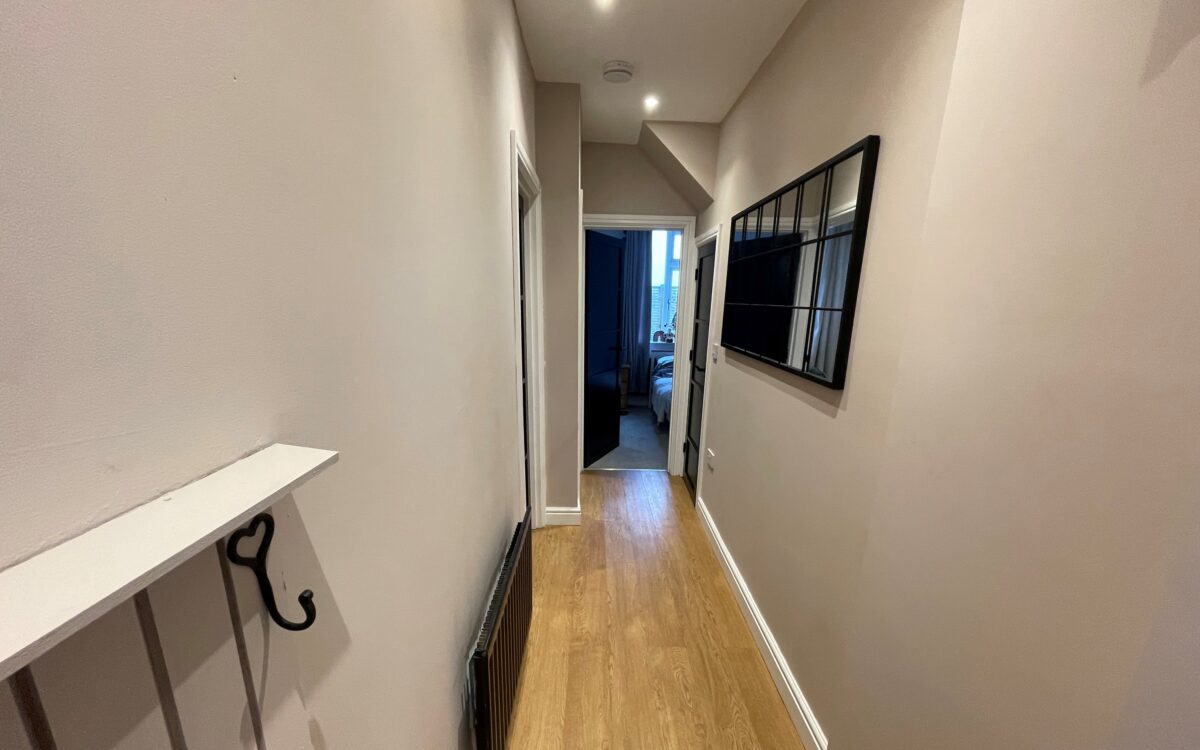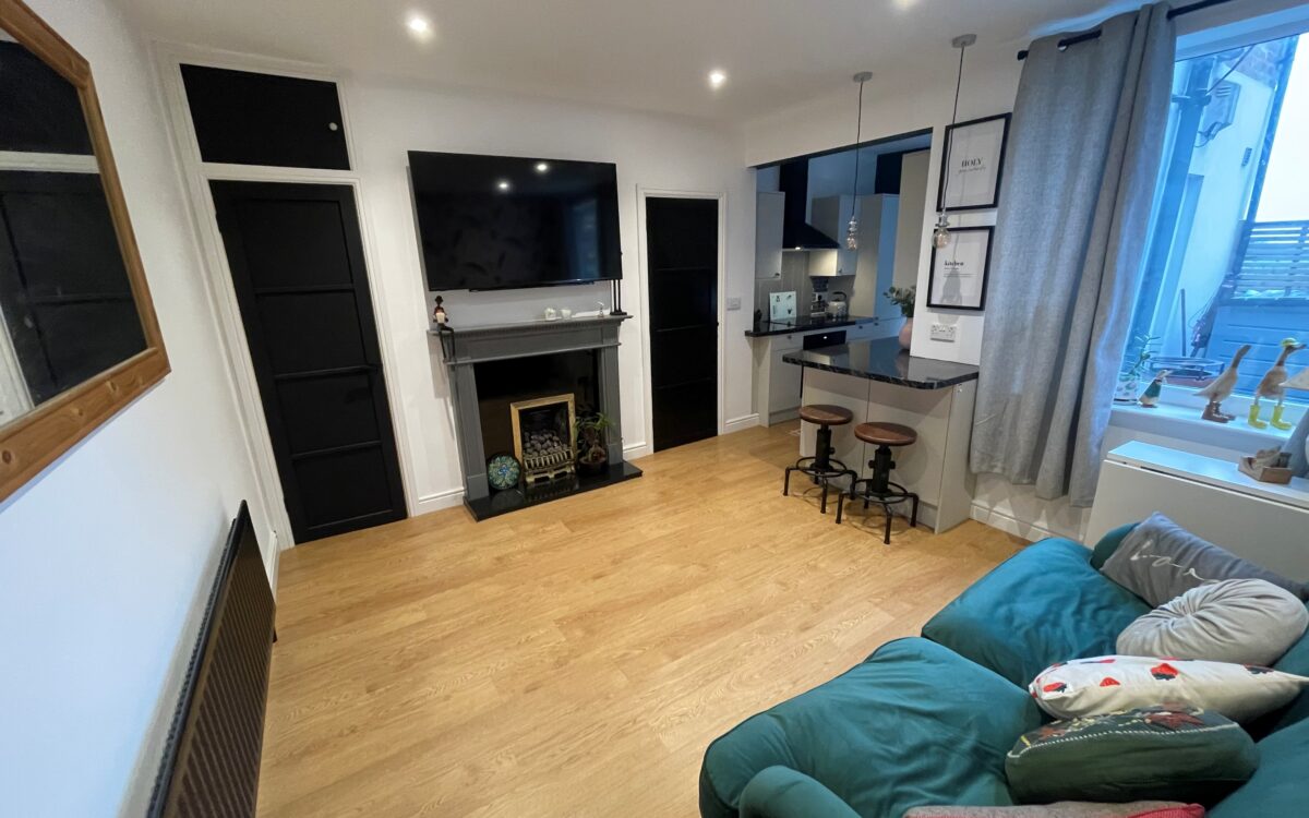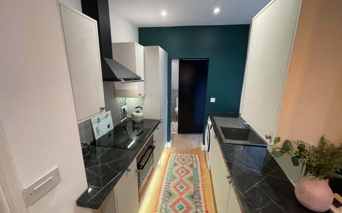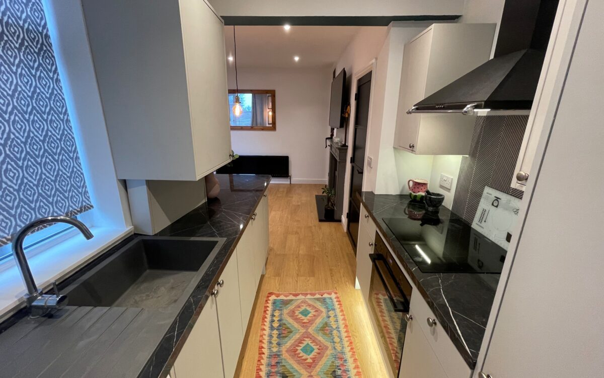 REFITTED KITCHEN: 7’7″ x 7’0″ (2.31m x 2.13m) with ‘Quartz’ sink & drainer, ‘Zanussi’ induction hob with illuminated extractor hood above, ‘Zanussi’ oven, integrated fridge freezer, plumbing for washing machine & uPVC double glazed window.