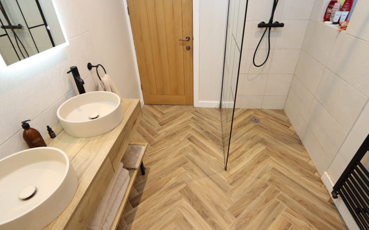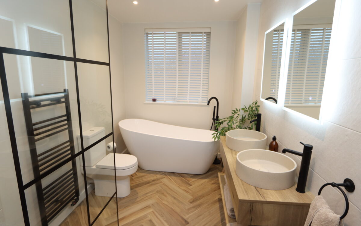 SUPERB REFITTED BATHROOM: (Installed 2024) 11’9″ x 610″ (3.63m x 1.86m) with twin vanity unit, freestanding bath, low level WC, tiled shower unit, 2 sensor touch illuminated mirrors, upright towel radiator, extractor fan, partially tiled walls and 2 uPVC double glazed windows.