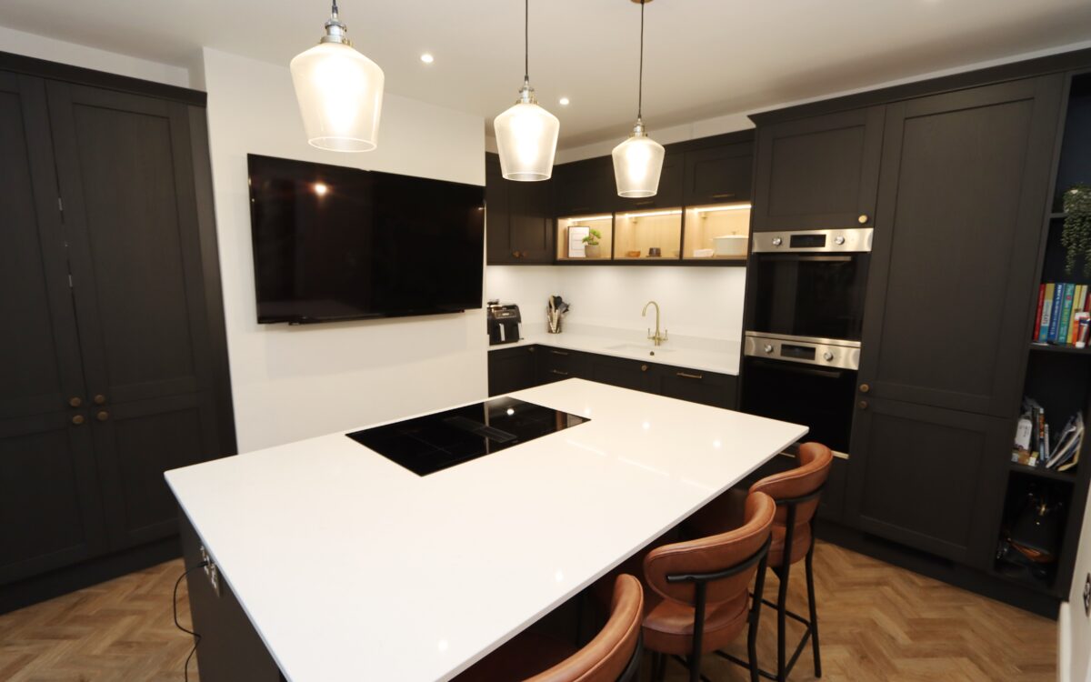 KITCHEN AREA: with fitted wall & floor units, illuminated display cabinets, 2 eye-level ovens, integrated dishwasher, integrated fridge/freezer, integrated microwave, Island unit housing ‘Lamana’ hob with built in fan, breakfast bar, 6 concealed downlighters, built in speaker, upright radiator and uPVC double glazed double doors to rear garden.