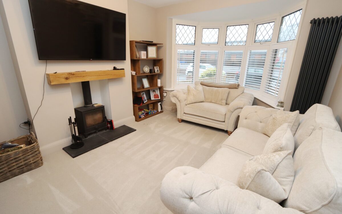 LOUNGE: to the front 11’5″ x 15’3″ (3.51m x 4.66m) including uPVC double glazed bay window with plantation shutters and log burner and radiator.