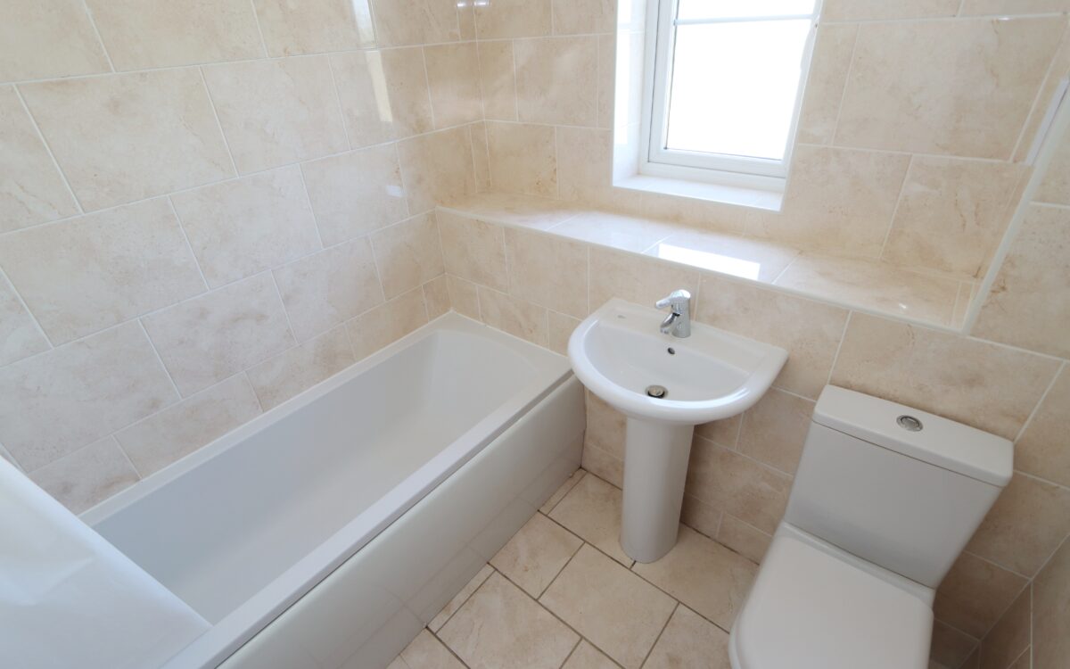 BATHROOM tiled walls & floor, panelled bath with shower over, pedestal washbasin, low level WC, extractor fan, upright stainless steel towel radiator & uPVC double glazed window.
