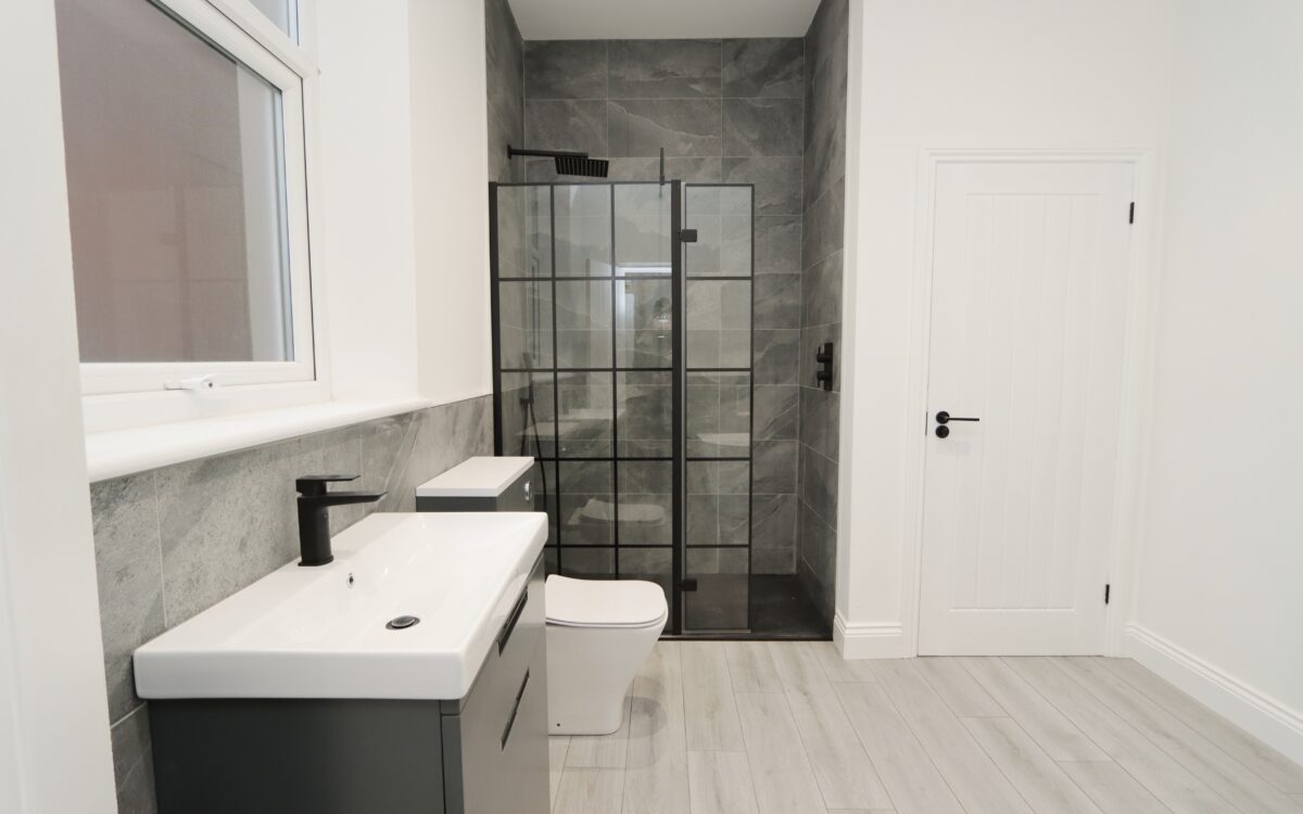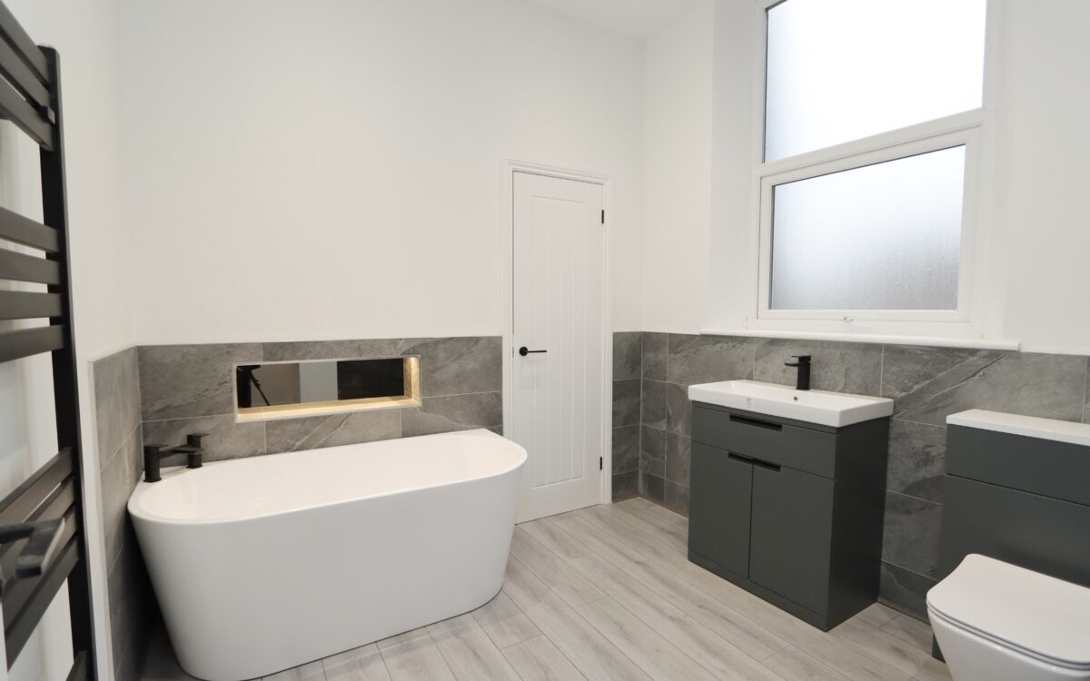 BATHROOM: refitted 2025, 11’ 2” x 8’ 7” (3.40m x 2.62m), laminate flooring, part tiled walls, black upright towel radiator, freestanding bath with tiled splashback and mirrored illuminated recess, cupboard housing ‘Main’ gas fired central heating combi boiler, low level WC, vanity unit with washbasin, large walk-in shower enclosure with rain head shower & secondary diverter, concealed down lighters and uPVC double glazed window.