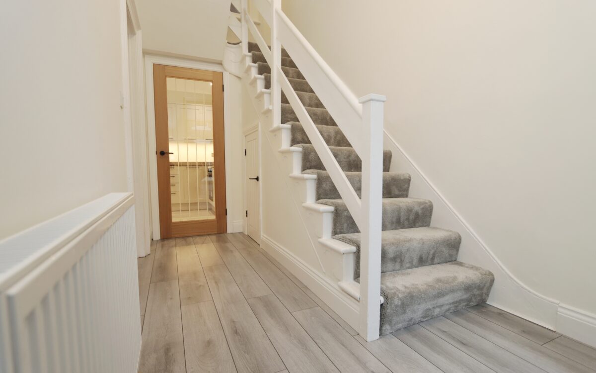 HALLWAY: 13’ 7” x 6’ 5” (4.14m x 1.96m), double banked radiator, laminate flooring, uPVC double glazed front door, meter cupboard, decorative corniced ceiling & plaster rose, fitted understairs store cupboard housing fuseboard, staircase to first floor and doors to lounge & kitchen.