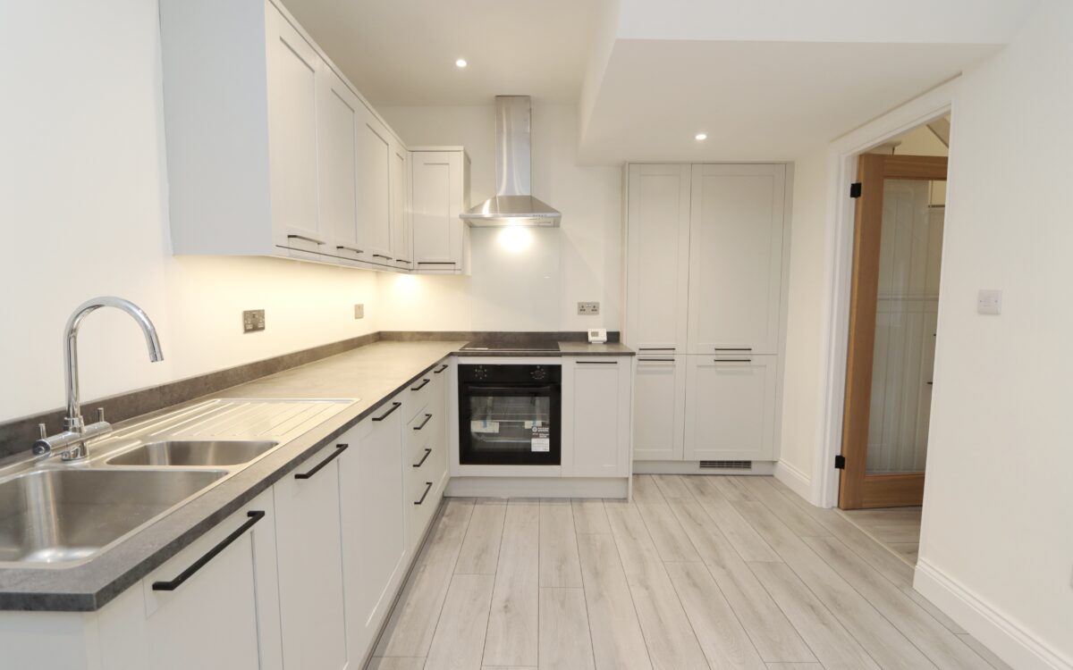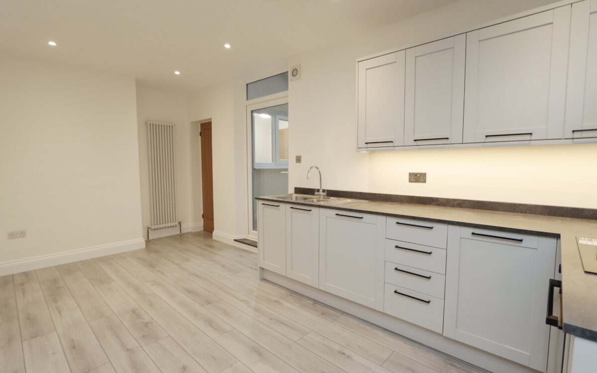 DINING KITCHEN: refitted 2025, 18’ 2” x 8’ 11” (5.54m x 2.72m – maximum overall measurement), good range of fitted wall & floor units with integrated applications including: ‘Lamona’ dishwasher, fridge & freezer, illuminated worksurfaces, ‘Lamona’ 4 ring electric hob with glass splashback and illuminated extractor hood above, ‘Lamona’ under bench oven, 1½ bowl stainless steel sink & drainer with matching mixer tap, contemporary upright radiator, laminate flooring, 8 concealed down lighters, extractor fan, uPVC double glazed door leading to rear yard, glazed door to hallway and door to utility room.