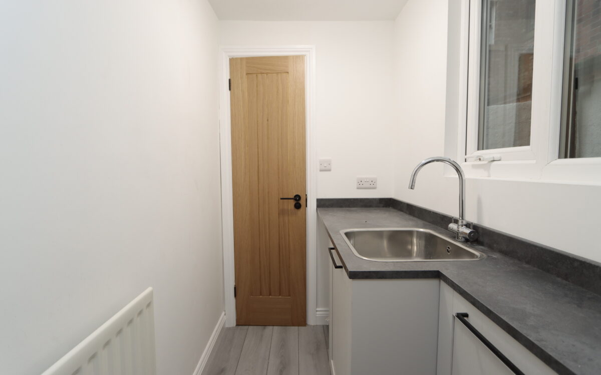 UTILITY ROOM: refitted 2025, 6’ 0” x 4’ 1” (1.83m x 1.24m), stainless steel sink with matching mixer tap, uPVC double glazed window, radiator, fitted floor cupboards, laminate flooring, plumbing for washing machine and door to downstairs WC.