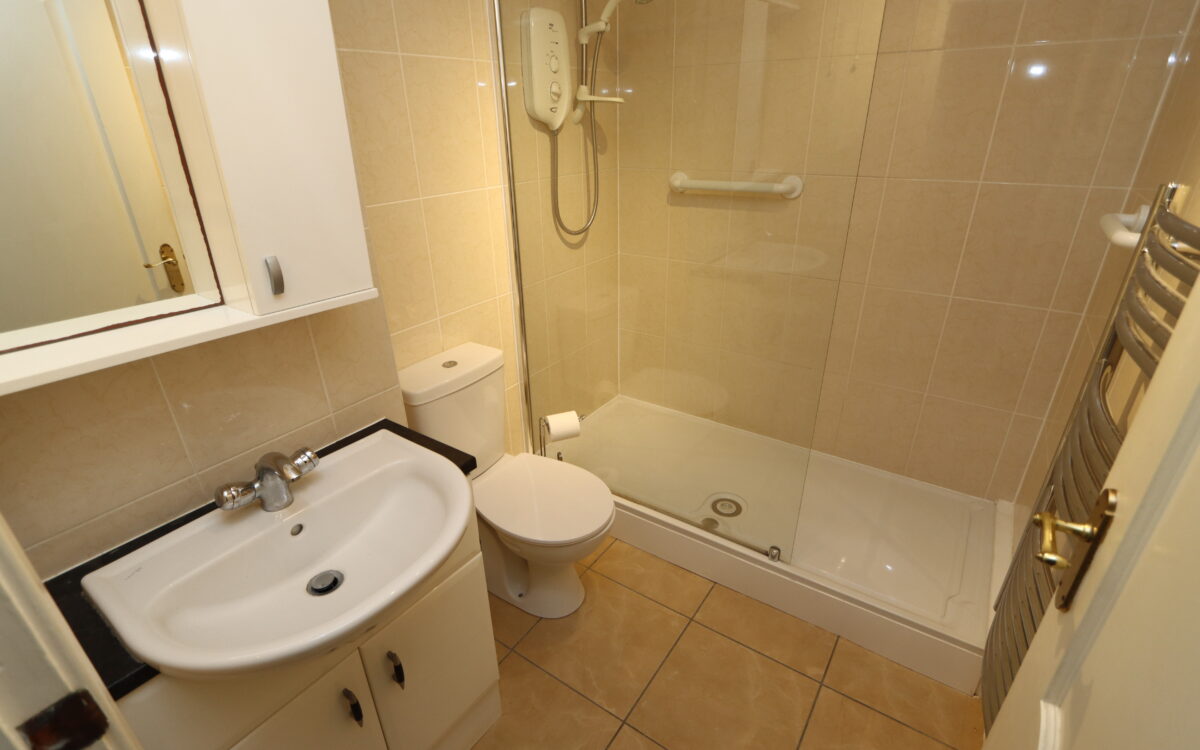 SHOWER ROOM: tiled walls, vanity unit with washbasin, mirrored & illuminated medicine cabinet, tiled floor, low level WC, stainless steel electric towel radiator, large tiled walk-in shower cubicle with ‘Mira Sport’ shower, PVC ceiling, extractor fan and 3 spot lights on track.