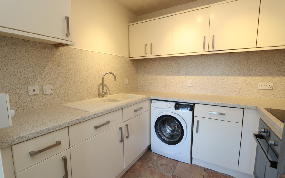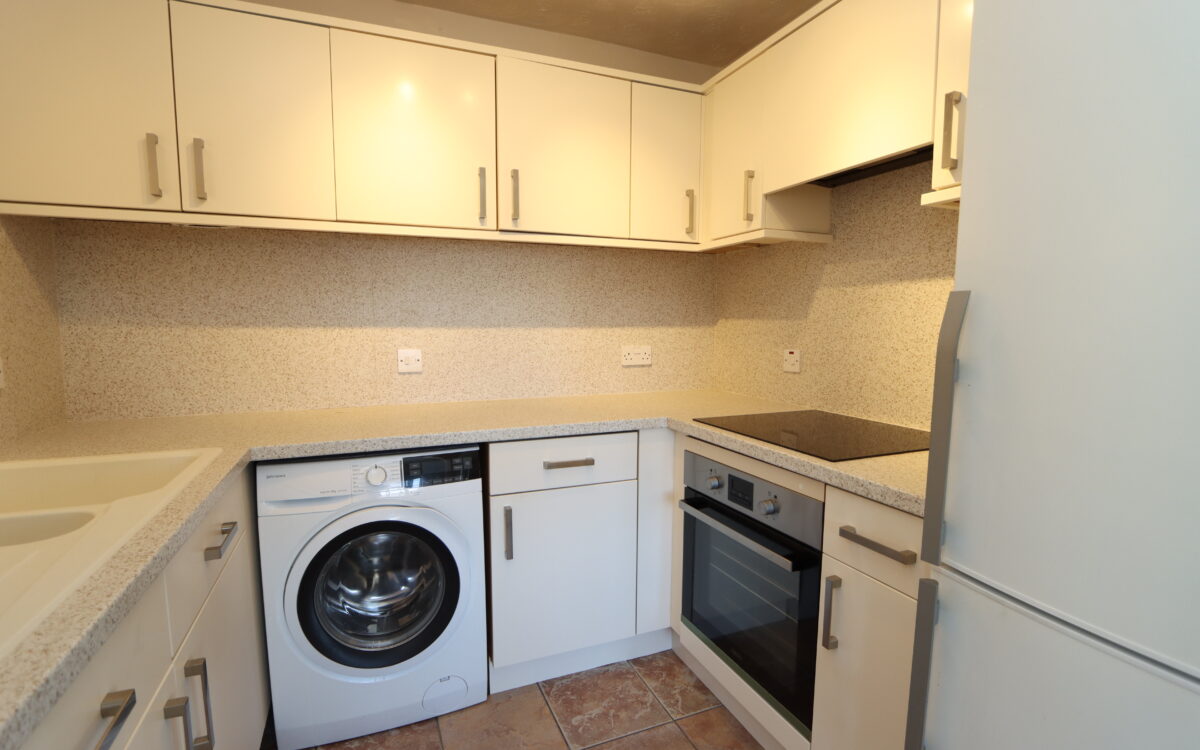 KITCHEN: 7’ 10” x 7’ 2” (2.39m x 2.18m), benchtops with matching splash backs, tiled floor, fitted wall & floor units, 1 ½ bowl ‘Blanco’ sink & drainer with stainless steel mixer tap, ‘John Lewis’ washing machine, ‘John Lewis’ fridge freezer, ‘Zanussi’ 4 ring induction hob with illuminated extractor hood above, ‘Zanussi’ under-bench oven, 4 spot lights on track and extractor fan.