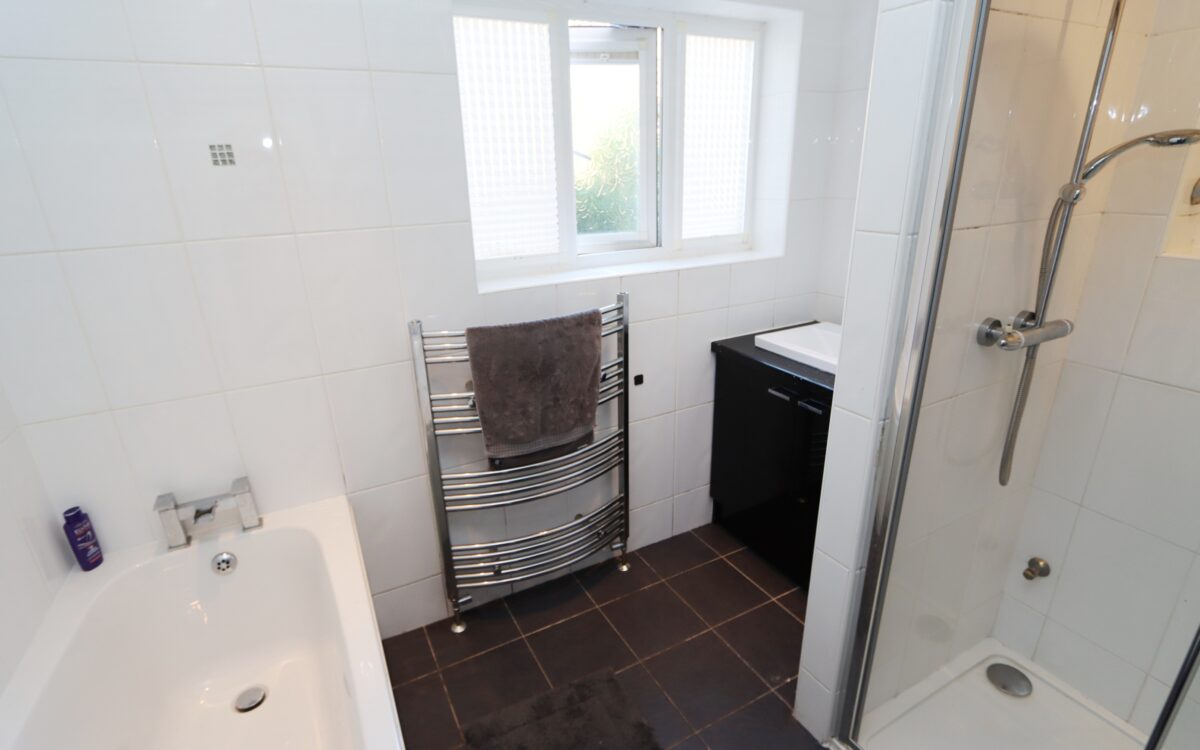 BATHROOM: tiled floor, tiled walls, panelled bath, vanity unit with washbasin, tiled shower cubicle, upright stainless steel towel radiator and uPVC double glazed windows.
