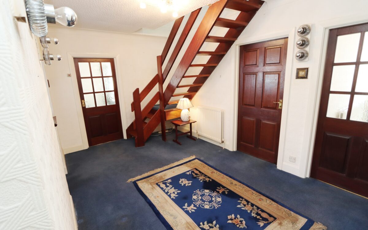 HALL: spacious hallway, 14’ 10” x 8’ 11” (4.52m x 2.72m), 2 double banked radiators, fitted cloaks cupboard and open tread staircase to first floor.