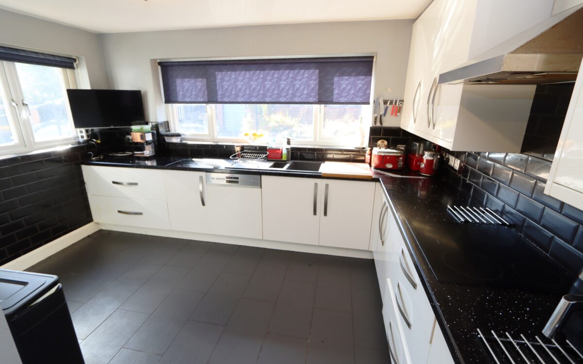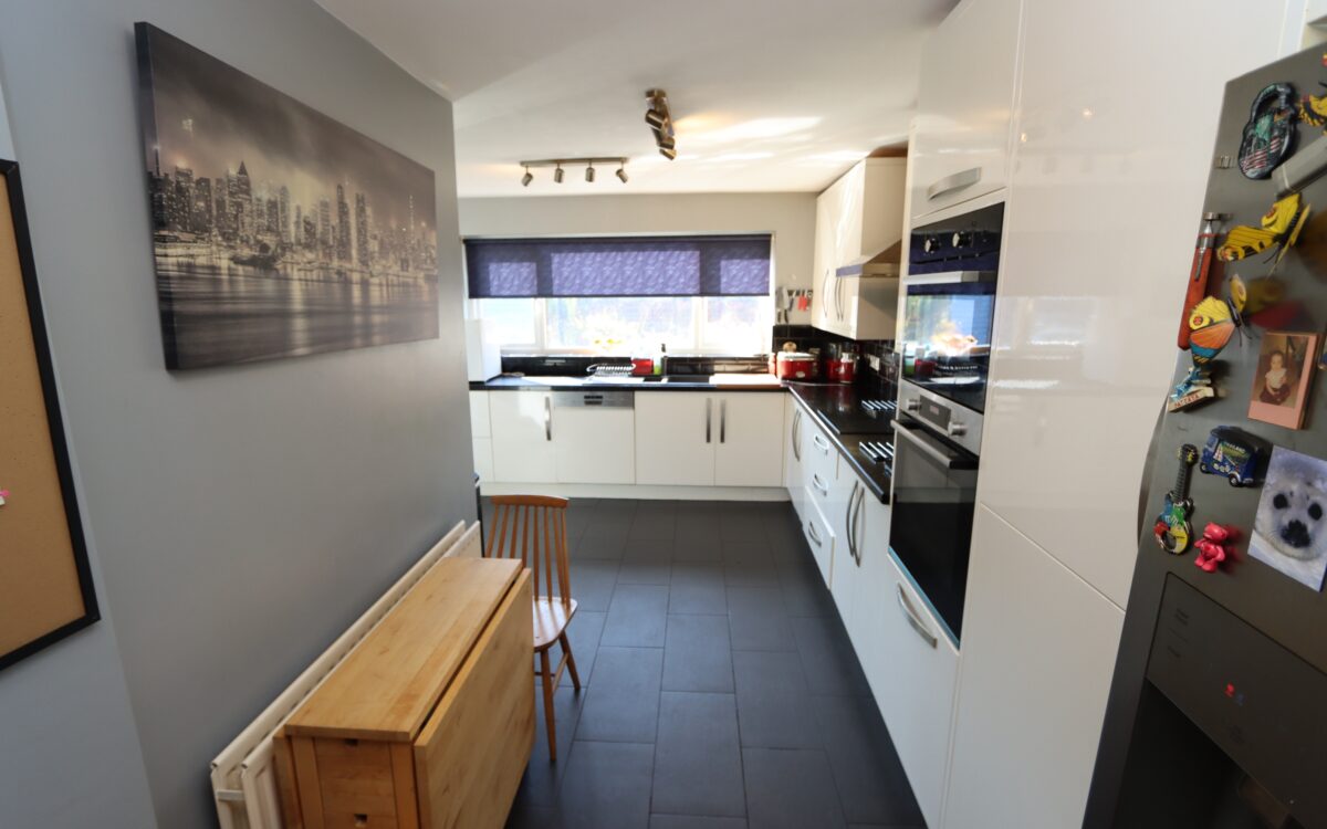 DINING KITCHEN: 19’ 8” x 12’ 8” (5.99m x 3.86m – ‘L’ shaped measurement), tiled floor, fitted wall & floor units, ‘Siemens’ dishwasher, 1 ½ bowl sink, ‘Bosch’ hob with stainless steel extractor hood above, ‘Bosch’ eye level oven, double banked radiator, 2 uPVC double glazed windows and door to rear garden.