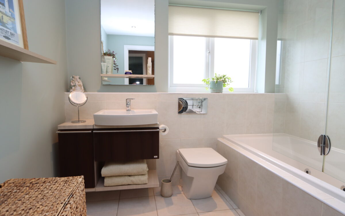 BATHROOM: tiled floor, part tiled walls, Jacuzzi style bath with shower over & screen, back to wall WC, vanity unit with surface washbasin & mixer tap, stainless steel upright radiator, uPVC double glazed window with roller blind and 4 concealed down lighters.