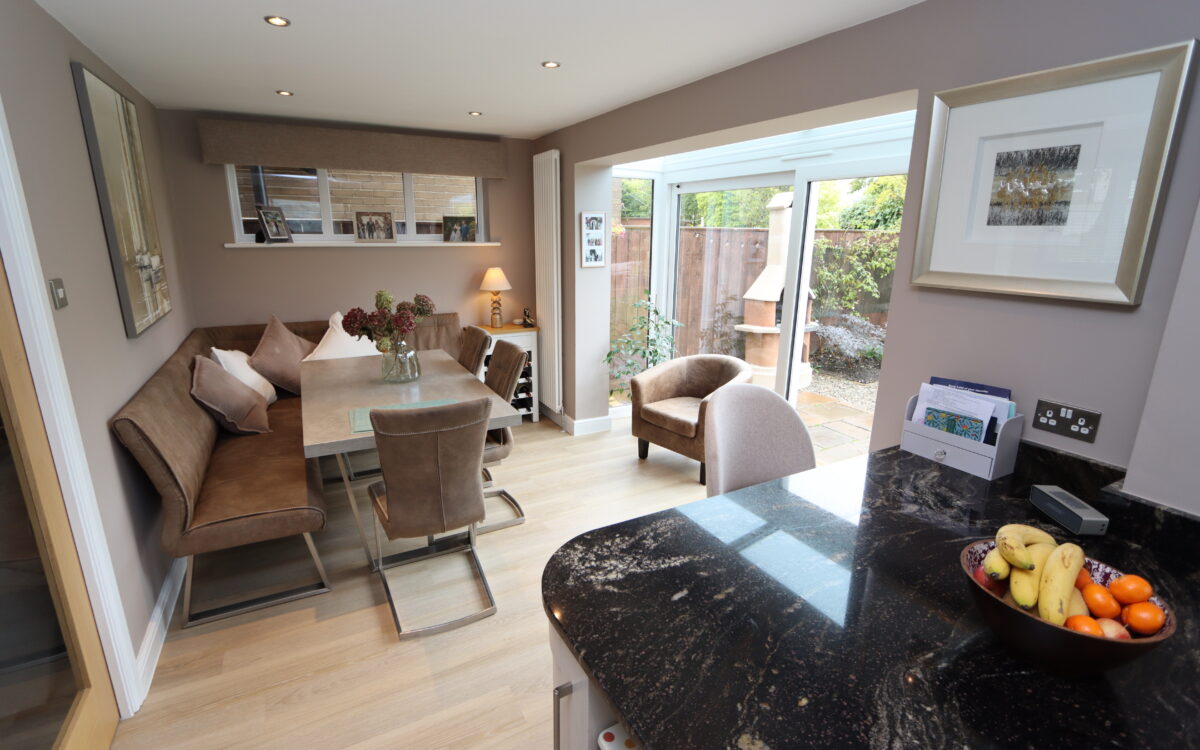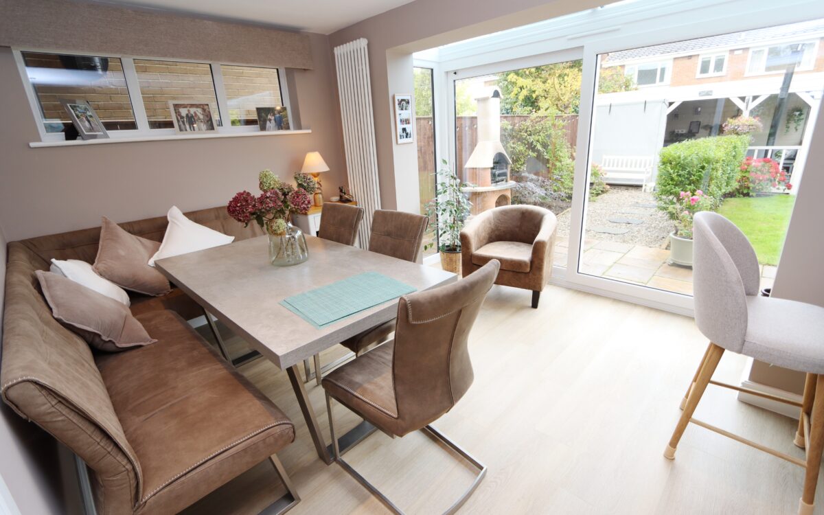 Dining area: upright radiator, fitted breakfast bar, uPVC double glazed patio doors overlooking and giving access to the rear garden, uPVC double glazed window and 6 concealed down lighters.