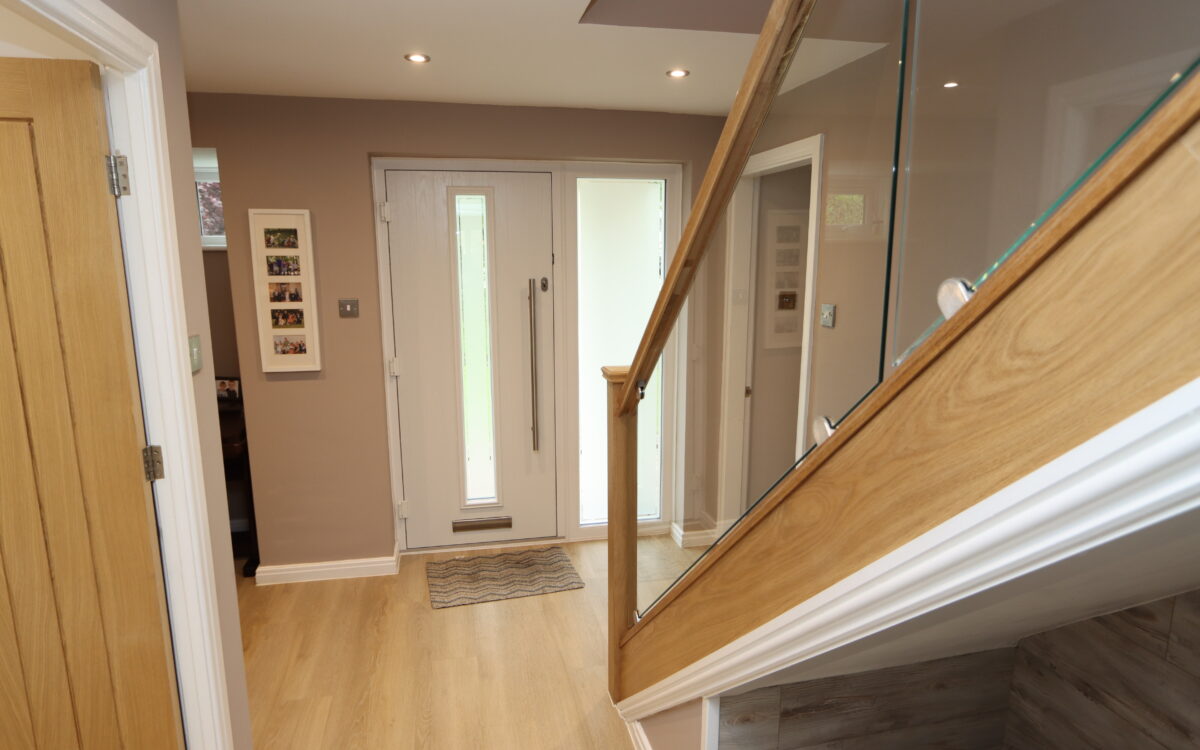 HALL: composite front door & uPVC double glazed side window, 2 cornel radiators, 6 concealed down lighters and feature oak & glass staircase leading to first floor.