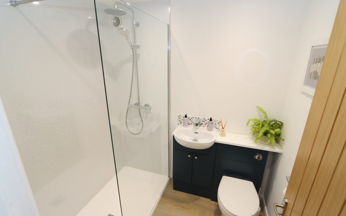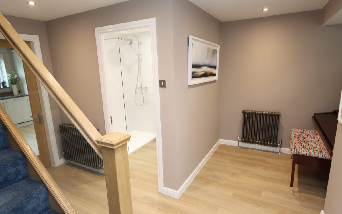 SHOWER ROOM: installed 2024, large walk-in shower cubicle with rain head shower & secondary diverter, vanity unit with washbasin & low level WC, 4 concealed down lighters, extractor fan and stainless steel upright towel radiator.