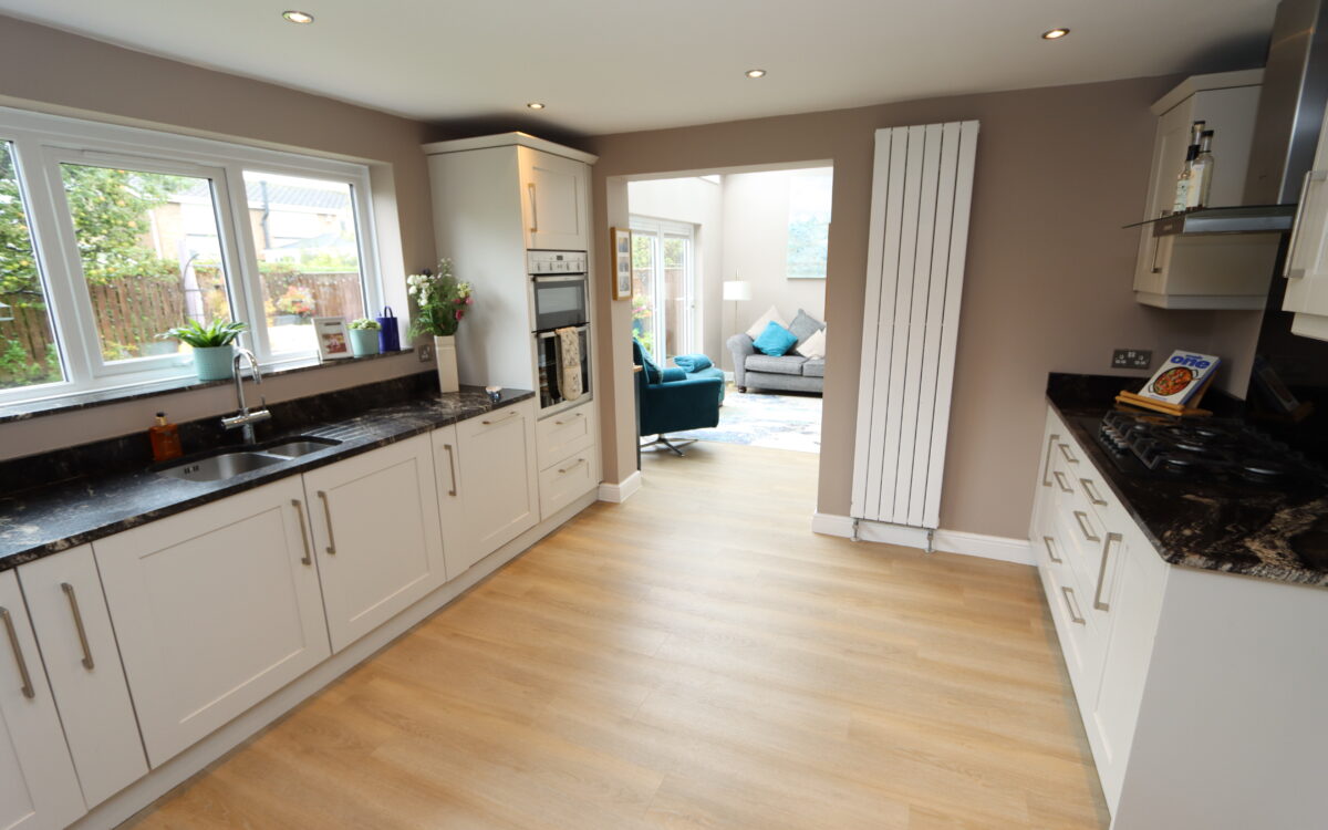 Kitchen area: an excellent range of fitted wall & floor units, granite worksurfaces & upstands incorporating inset 1½ sink, drainer & mixer tap, ‘Neff’ 5 ring gas hob with splashback and illuminated extractor hood above, ‘Neff’ eye level oven, integrated dishwasher, upright radiator, 9 concealed downlighters and uPVC double glazed window with garden aspect.