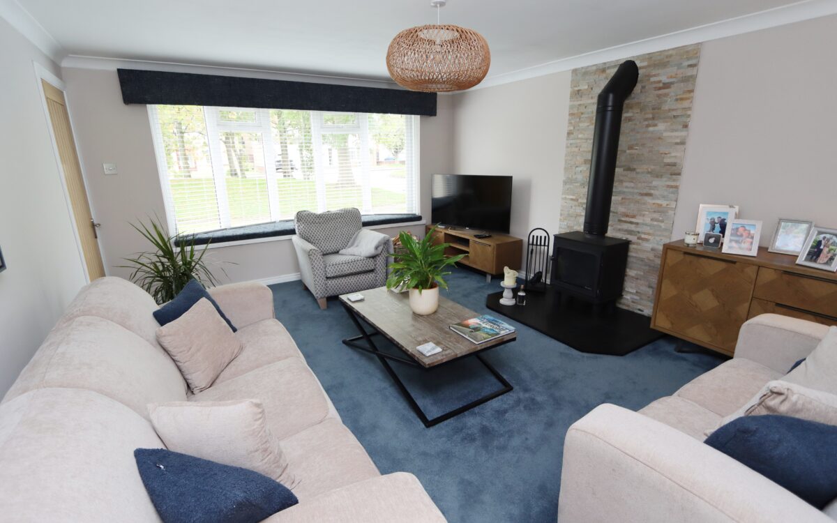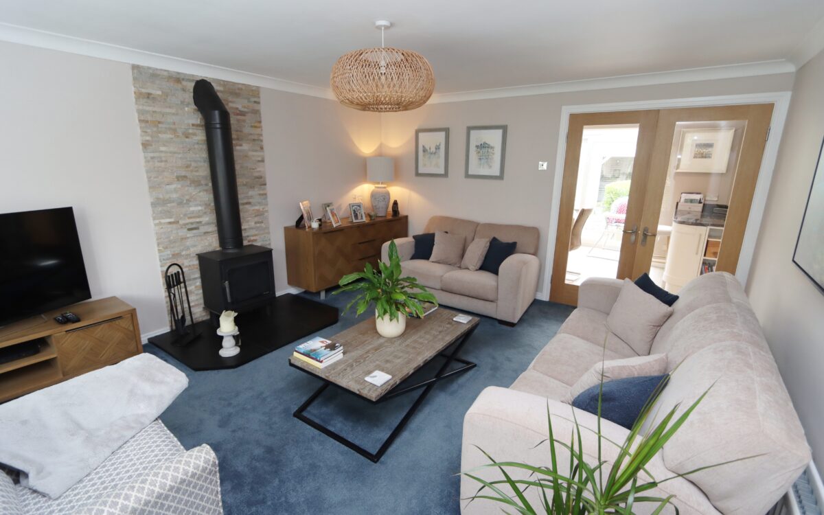 LOUNGE: at front, 15’ 9” x 13’ 2” (4.80m x 4.01m) plus uPVC double glazed ‘Oriel’ bay window with seat, venetian blinds & fairly open aspect, double banked radiator, glazed double opening doors to kitchen and feature log burner with stone hearth and feature tiling behind.