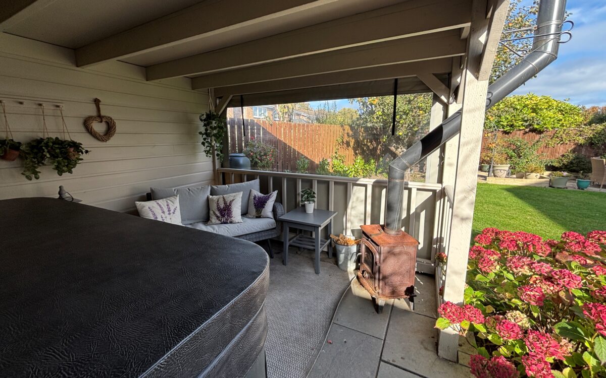 GARDENS: the front has a block paved driveway providing off road standage for numerous vehicles, paved walkways and shaped lawn. Well maintained, landscaped rear garden with large paved patio, shaped lawn, established planted borders, well fenced perimeter, BBQ, and covered patio with seating area, hot tub and multi fuel burner.