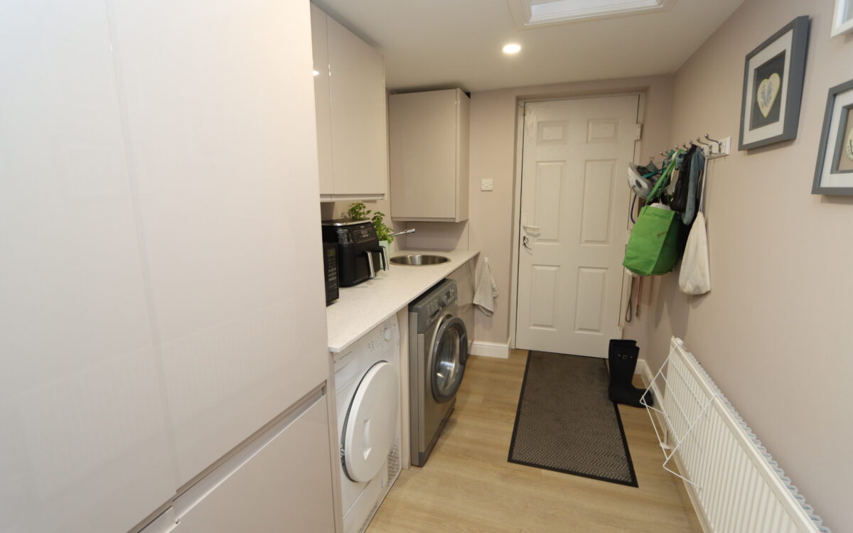 UTILITY ROOM: 14’ 6” x 6’ 1” (4.42m x 1.85m), installed September 2024, hi-gloss fitted wall & floor units, radiator, plumbing for washing machine, circular stainless steel sink, cupboard housing ‘Worcester’ gas fired combination boiler and door leading to side entrance.