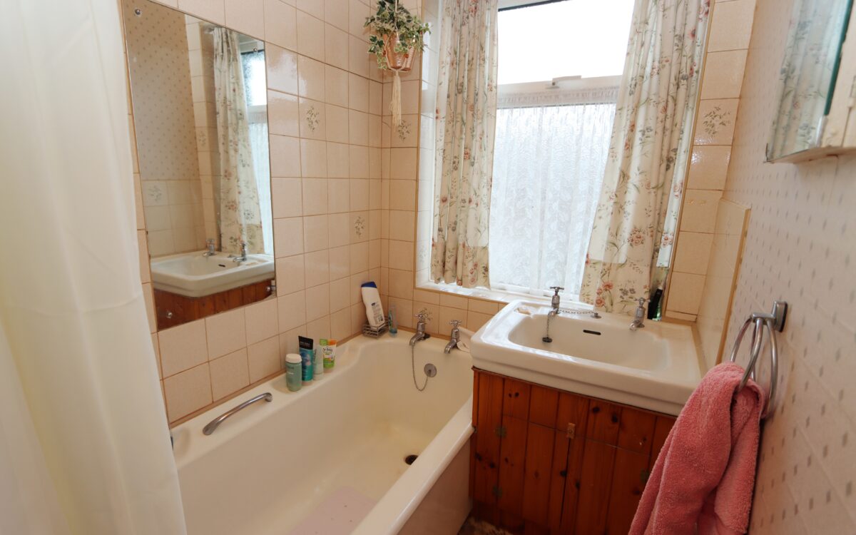 BATHROOM: partially tiled walls, panelled bath, washbasin, airing cupboard and uPVC double glazed window.
