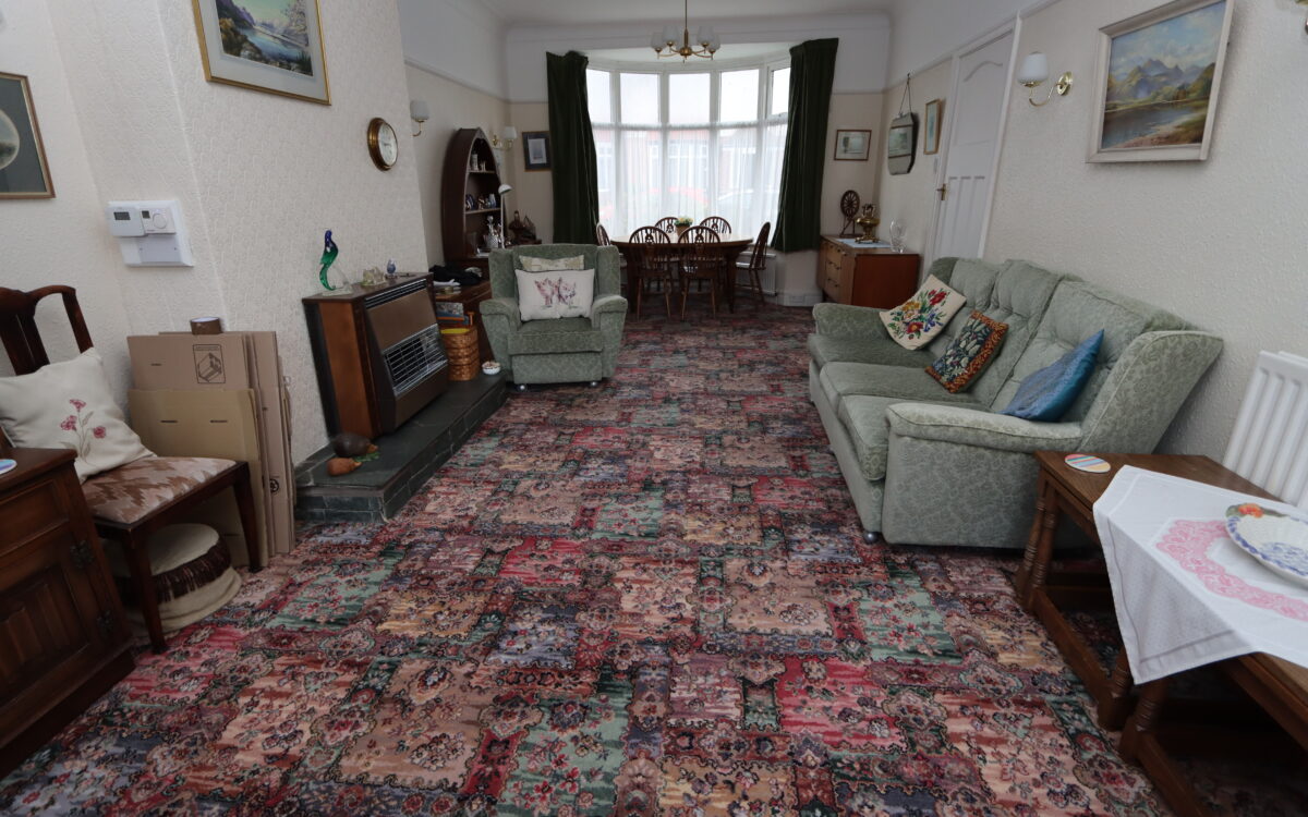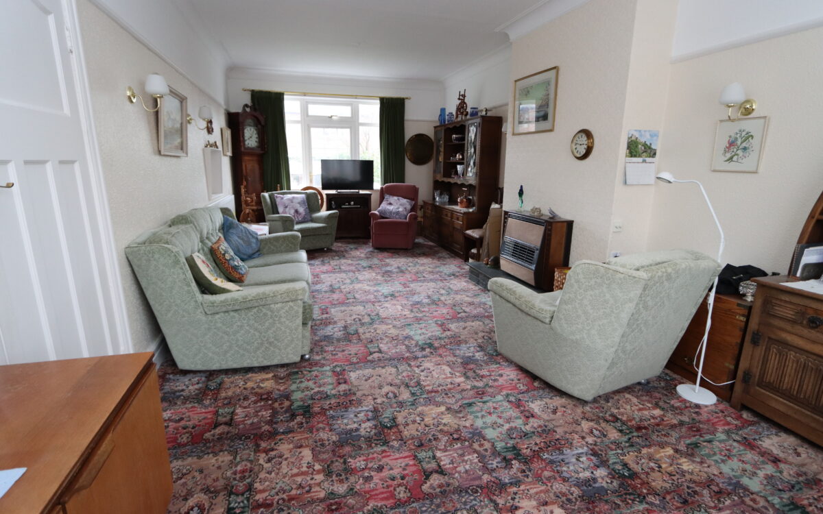 THROUGH LIVING ROOM: 30’0″ x 12’0″ (9.14m x 3.66m) including uPVC double glazed bay window, fitted gas fire with ‘Baxi Bermuda’ back boiler, 2 radiators, picture rail, serving hatch to the kitchen, uPVC double glazed window and uPVC double glazed door to rear garden.