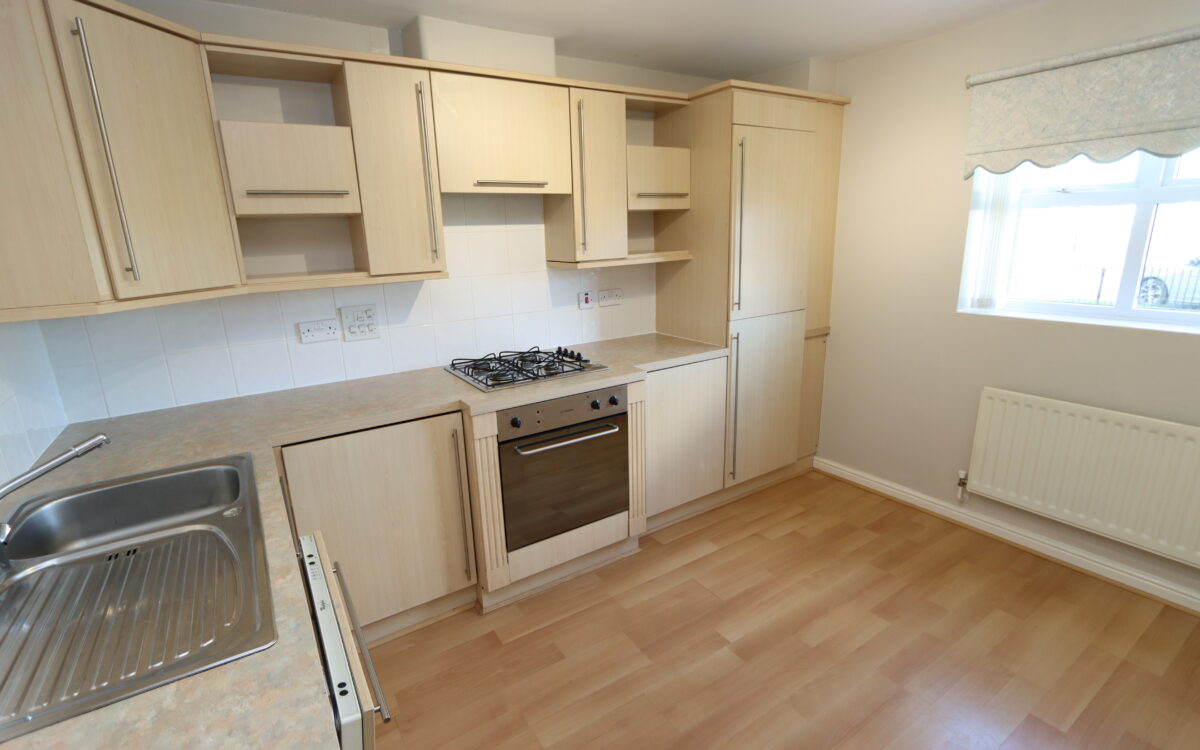 DINING KITCHEN 11’4″ x 9’10” (3.45m x 3.00m) fitted wall and floor units, ‘Whirlpool’ gas oven & hob, ‘Beko’ washing machine, integrated ‘ Whirlpool’ dishwasher, partially tiled walls, integrated fridge/freezer, stainless steel sink with drainer, radiator & uPVC double glazed window with vertical louvre blind.