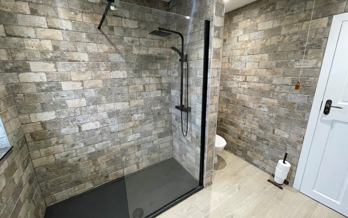 SUPERB REFITTED BATHROOM: 9’1″ x 7’8″ (2.77m x 2.34m) Installed approx. 2022 with tiled brick walls, large walk-in shower cubicle, pedestal washbasin, low level WC, radiator, 5 concealed downlighters and 2 uPVC double glazed windows.