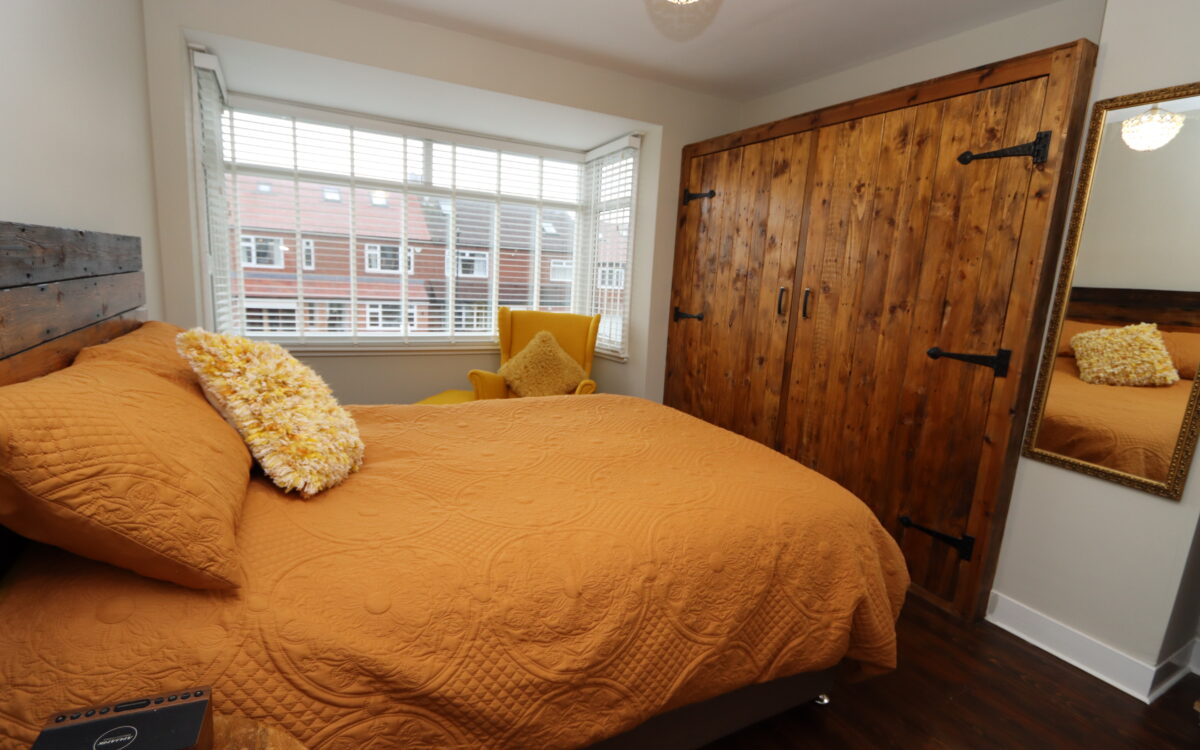 No. 1: at the front 15’6″ x 10’10” (4.72m x 3.30m) including square uPVC double glazed bay window with venetian blinds, including large double fitted wardrobe and radiator.