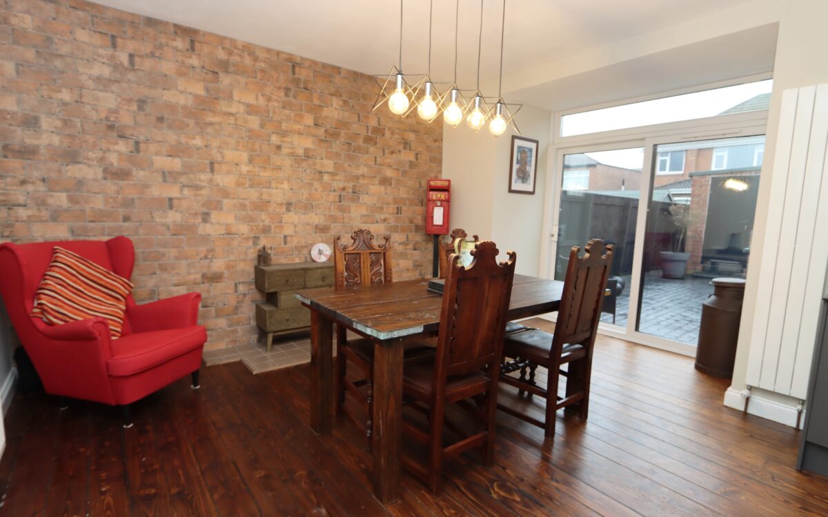 DINING AREA: with feature brick tiled wall, 2 radiators and uPVC double glazed patio doors to the rear garden.