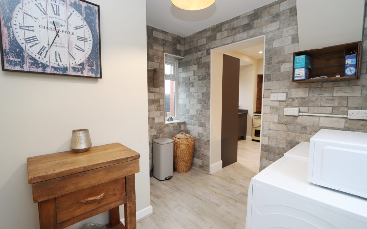 UTILITY ROOM: 9’2″ x 8’10” (2.79m x 2.69m) with plumbing for washing machine, power, light, ‘Baxi’ combi-boiler (installed approx. 2019), 3 brick tiled walls, 2 uPVC double glazed windows and uPVC double glazed door to rear garden.