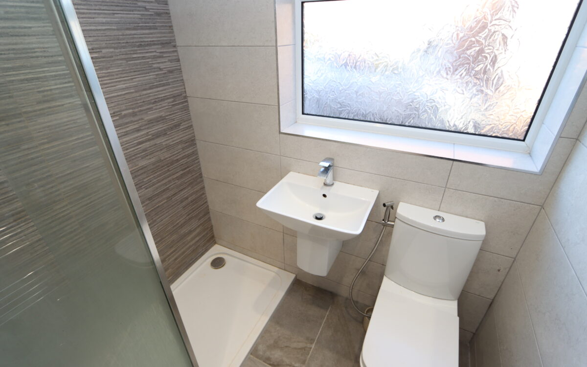 REFITTED SHOWER ROOM: fully tiled walls, tiled floor, large walk-in shower cubicle, washbasin, low level WC, upright stainless steel towel radiator and uPVC double glazed window.