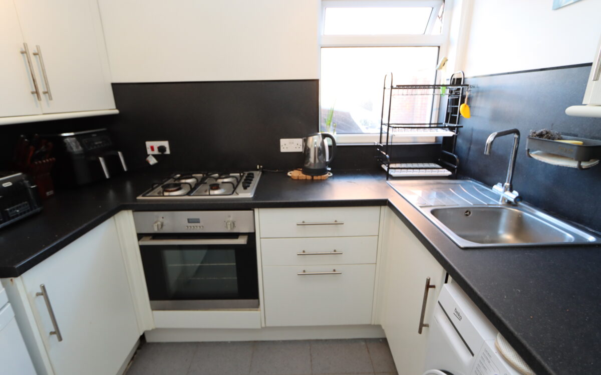 KITCHEN: 8’2″ x 5’9″ (2.49m x 1.75m) with stainless steel sink, plumbing for washing machine, ‘Lamona’ gas hob, ‘Lamona’ oven, fitted floor and wall units and uPVC double glazed window.